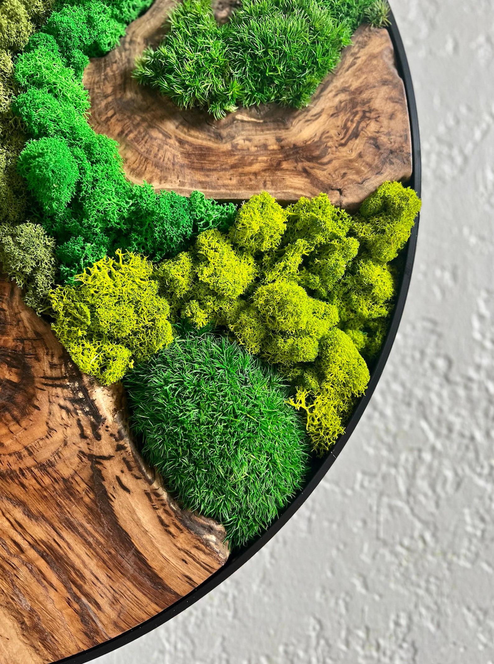 - This stunning 24-inch moss art circle adds a touch of the outdoors to your home or office. The vibrant green preserved moss is set within a beautiful, naturally finished wooden frame. Perfect for adding a calming and natural element to any space, this piece is ideal for brightening up your living room, bedroom, or workspace. It also makes a thoughtful and unique gift for Mother's Day or any special occasion. The preserved moss requires no maintenance, help lasting beauty. Bring the serenity of nature indoors with this eye-catching and stylish wall art. A wonderful addition to any interior design scheme.