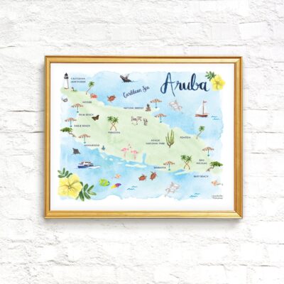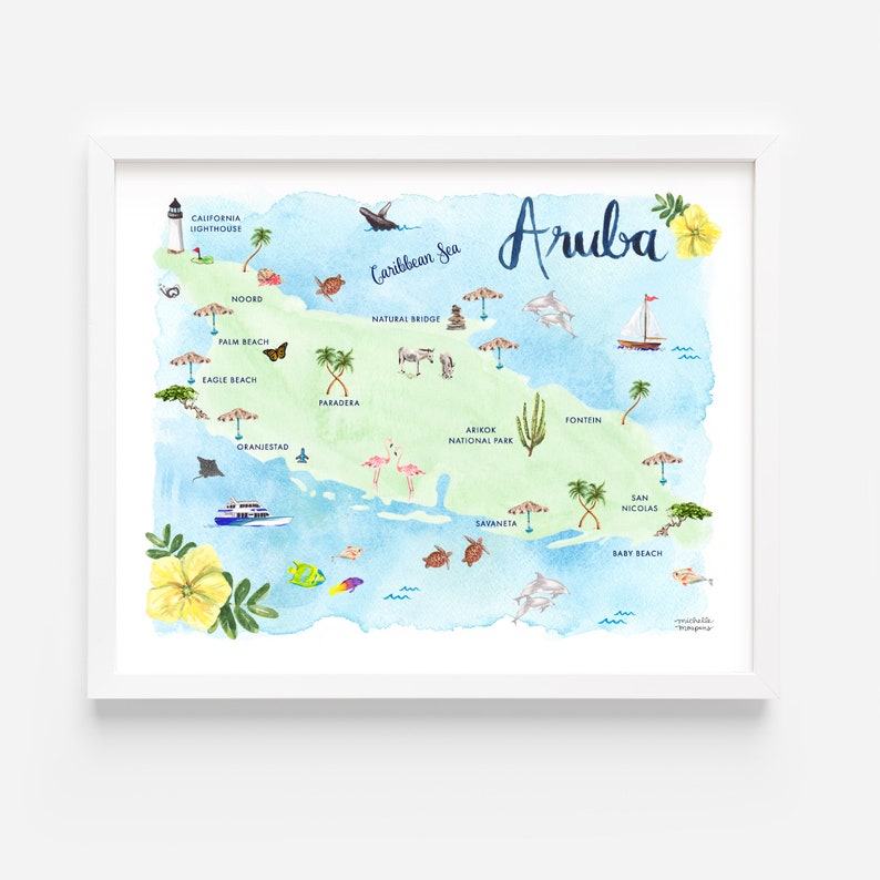 - Capture the vibrant beauty of Aruba with this stunning art print, showcasing iconic landmarks like Eagle Beach and Oranjestad.