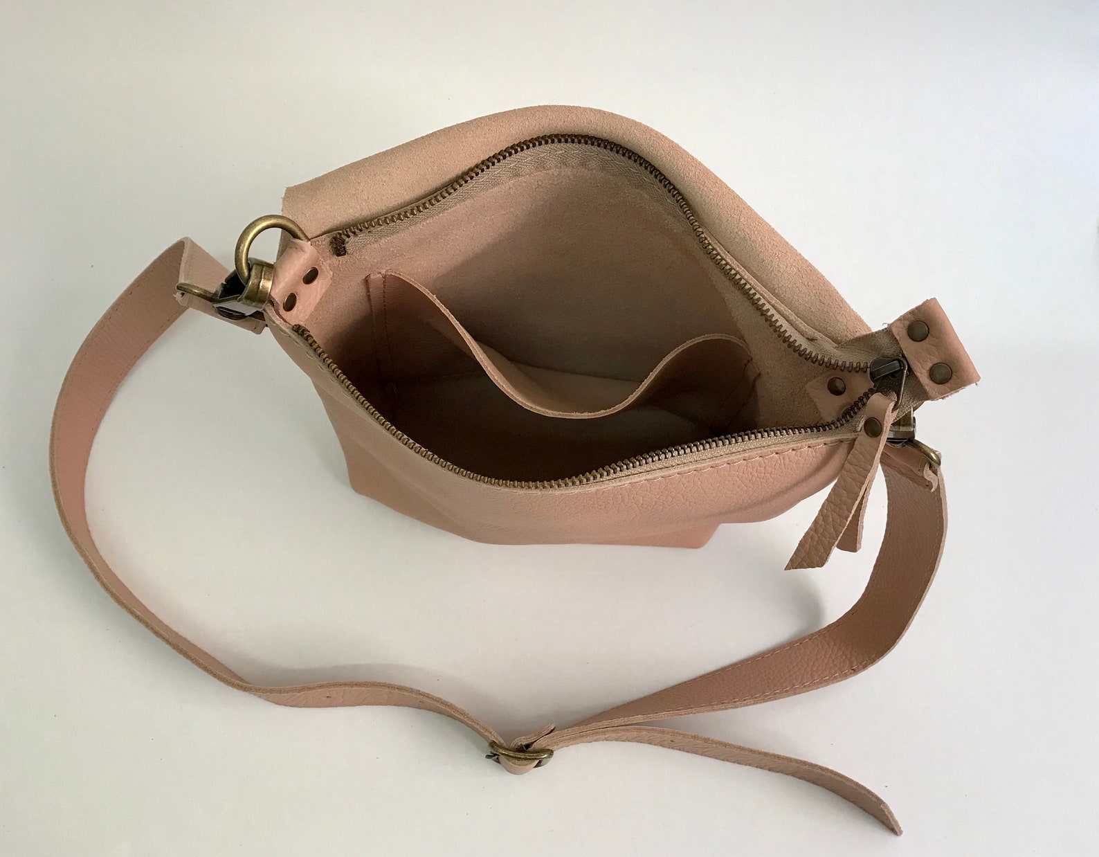 - This handcrafted leather crossbody bag is the ideal everyday accessory. Made from durable leather, this stylish bag features an adjustable strap for comfortable wear. The spacious main compartment, secured with a zip closure, offers ample room for your belongings, while the interior slip pocket helps keep you organised. Available in a stunning array of 16 vibrant colours, you're sure to find the perfect match for your wardrobe. Whether you're running errands or meeting friends, this versatile bag is both practical and chic.