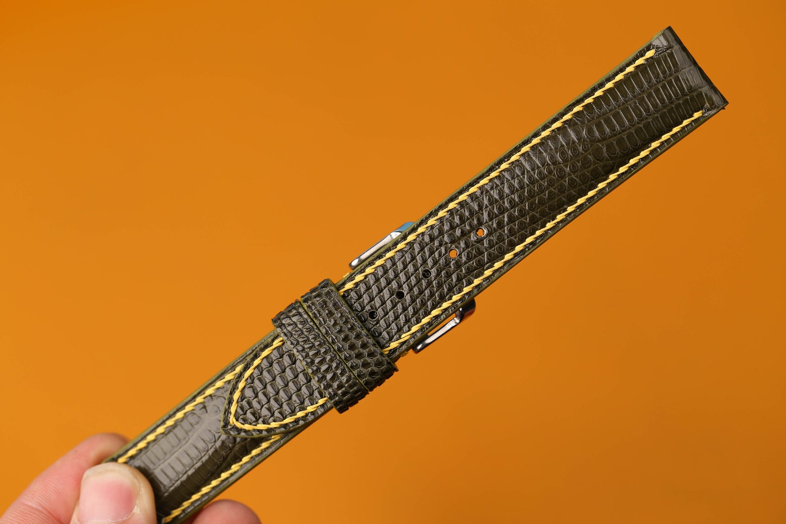 Elevate your timepiece with this handcrafted, premium dark green leather watch strap. Designed for a luxurious and sophisticated aesthetic, this strap is compatible with a wide array of prestigious watch brands, including Panerai, Omega, Breitling, IWC, Grand Seiko, and Rolex. The vintage-inspired design showcases intricate stitching and a polished buckle, adding a touch of timeless elegance. Crafted from genuine leather, this strap offers exceptional durability and comfort, for a secure and comfortable fit on your wrist. Available in various lengths to accommodate different wrist sizes, this strap is the perfect way to revitalise your favourite watch. A stylish and robust choice for discerning horologists.
