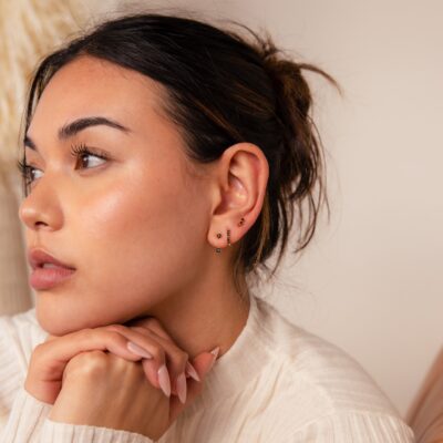 - Secure Fastening: Hoop earrings with hinged fastening, ear jackets with post and butterfly backs