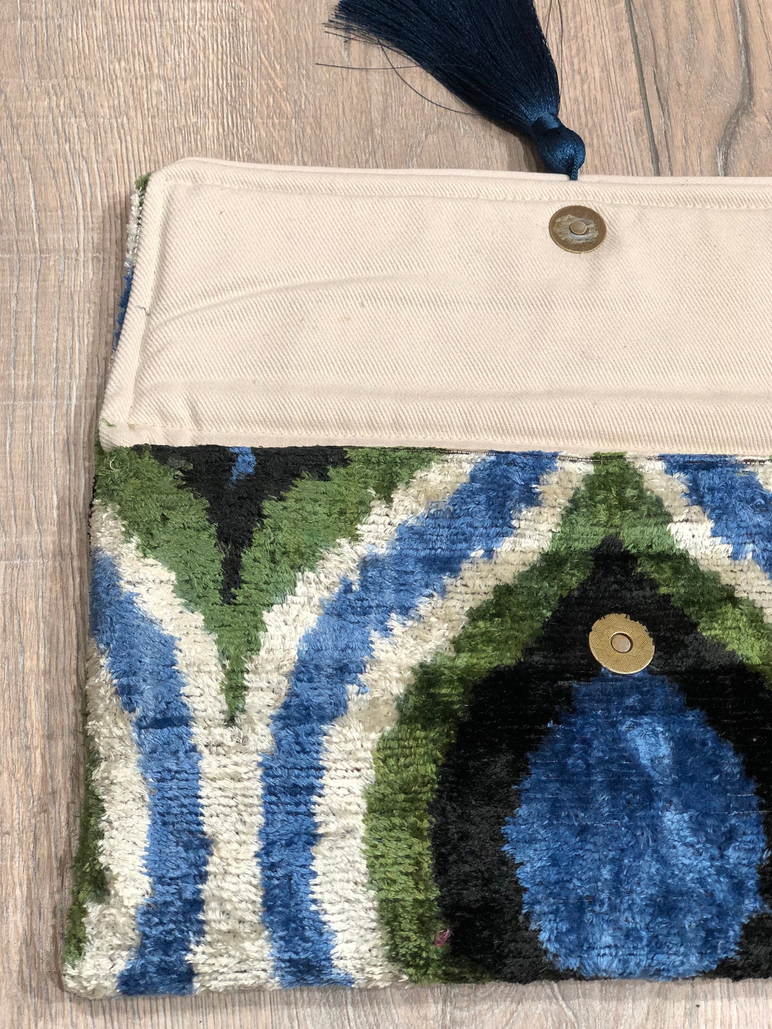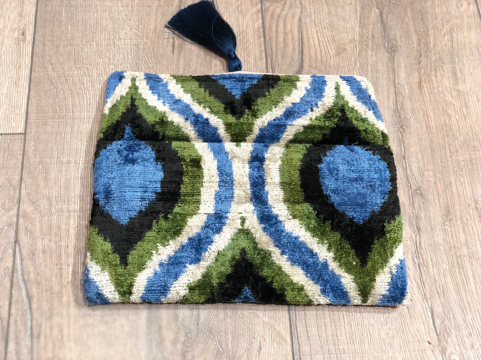 - Blue Ikat Clutch Bag: Handcrafted with intricate ikat patterns in vibrant blue hues, this clutch exudes bohemian charm. A stunning accessory to elevate any outfit.