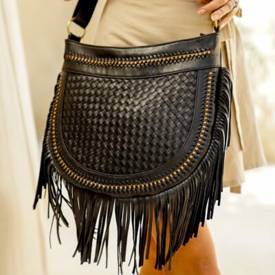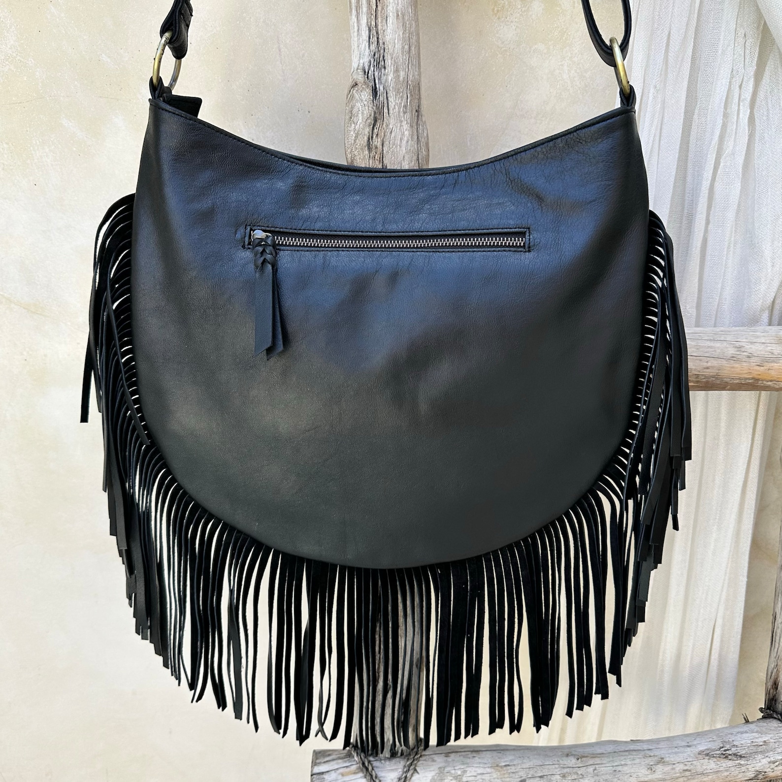 Boho Chic Black Leather Tassel Cross Body Bag for a Touch of Bohemian Style