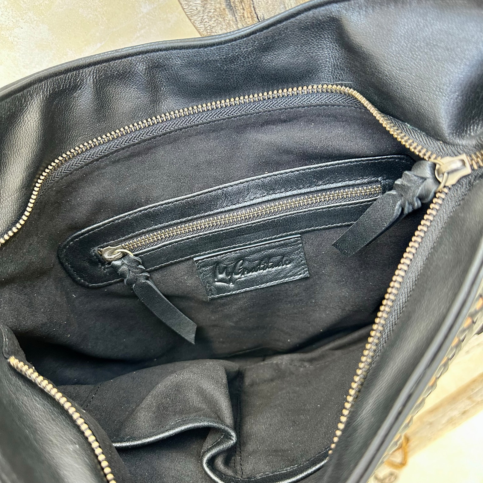 This genuine black leather crossbody bag exudes bohemian charm. The intricate fringe detailing adds a playful and stylish touch, perfect for adding character to any outfit. Featuring an adjustable shoulder strap, this bag fors a comfortable fit, whether you're running errands or exploring a new city. The spacious interior boasts multiple compartments, allowing for effortless organisation of your essentials. A magnetic snap fastening provides both easy access and peace of mind, keeping your belongings safe and secure. A versatile and fashionable accessory, this leather crossbody bag is ideal for everyday use.