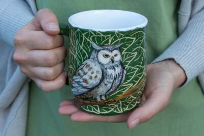 - Handcrafted ceramic mug featuring a charming owl illustration.