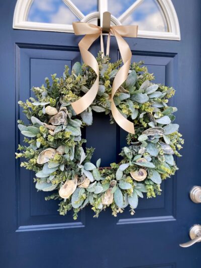 - Coastal-themed wreath lavishly decorated with natural oyster shells, radiating a breezy, seaside charm.