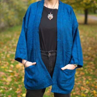 - Indulge in this luxurious cobalt blue yak wool kimono, hand-crafted in Nepal.