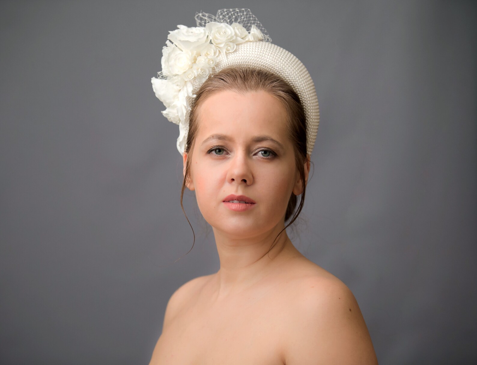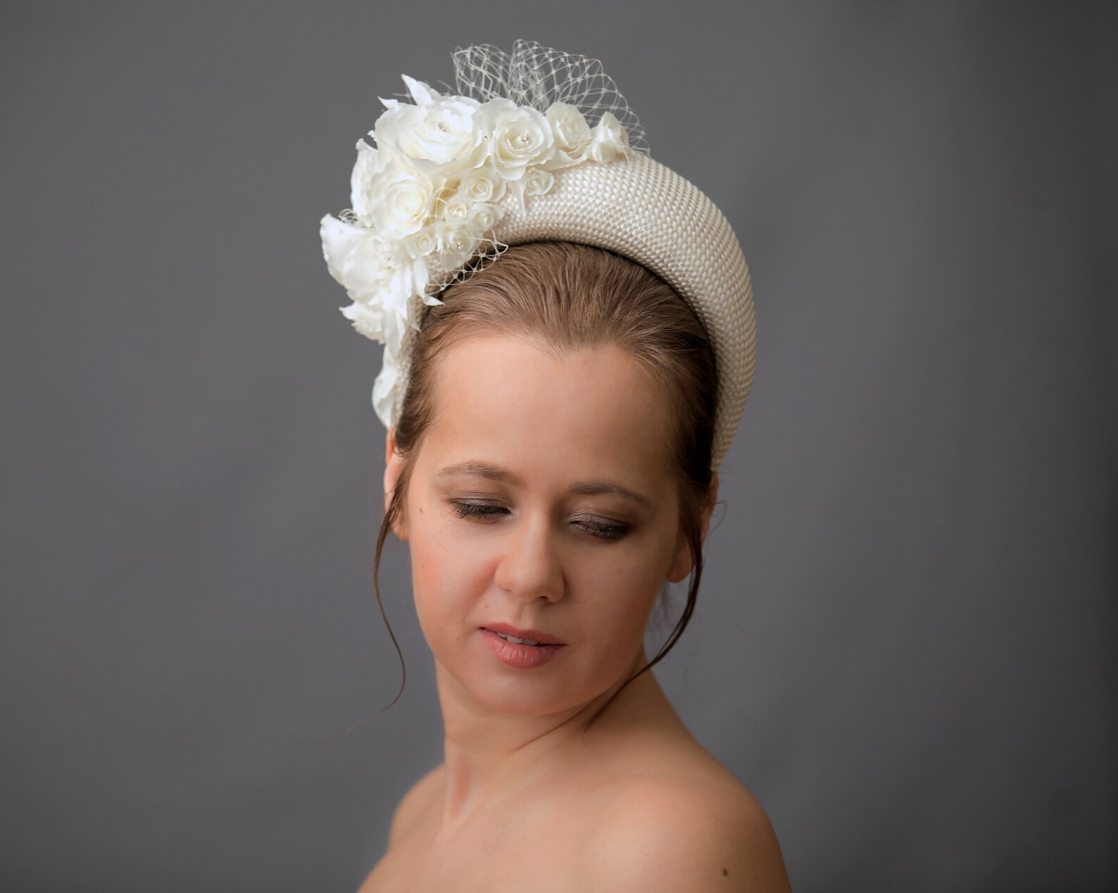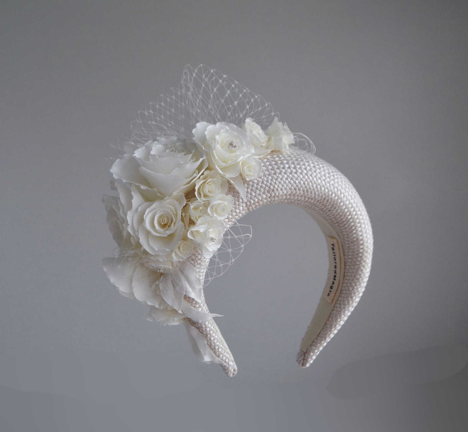Regal Cream Fascinator Headband with Birdcage Veil: Elevate Your Bridal Look (British English)