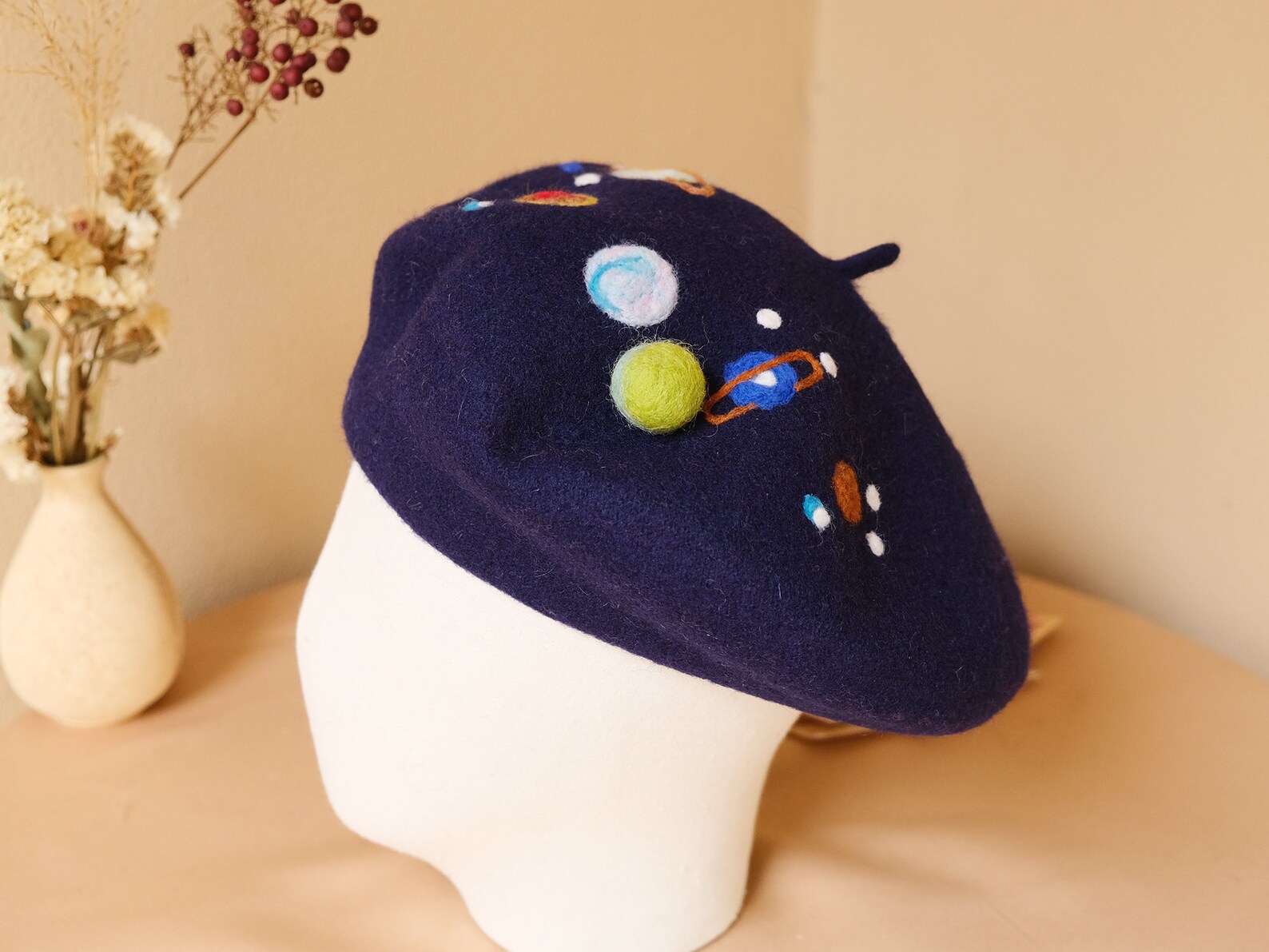 This Starry Night wool beret is the perfect accessory to elevate your autumn and winter wardrobe. Crafted from a soft and comfortable 95% wool felt, this beret offers both warmth and style. The unique star pattern adds a touch of individuality, making it a standout piece. This navy beret is ideal for women seeking a chic and practical headwear option. Whether you're looking for a festive Christmas beret or simply a stylish way to keep warm during the colder months, this beret is a versatile choice. The painter's hat design adds a touch of artistic flair, making it a fashionable and functional addition to your collection of autumn/winter accessories.