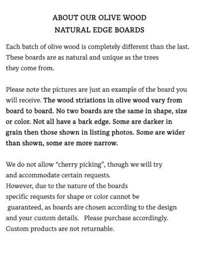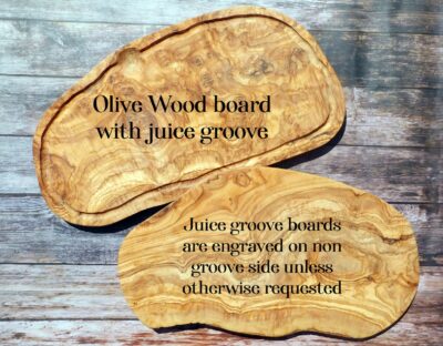 - This beautifully crafted olive wood serving board brings a touch of Mediterranean charm to your home. Each board is unique, showcasing the natural grain and character of the wood. Perfect for presenting cheeses, cured meats, appetisers, or even using as a stylish breadboard. Personalise it with an engraving to create a truly special gift for weddings, anniversaries, or housewarmings. Its robust construction fors it will be a cherished part of your kitchen for years to come. Simply wipe clean after use to maintain its natural beauty. A stunning and practical addition to any home.