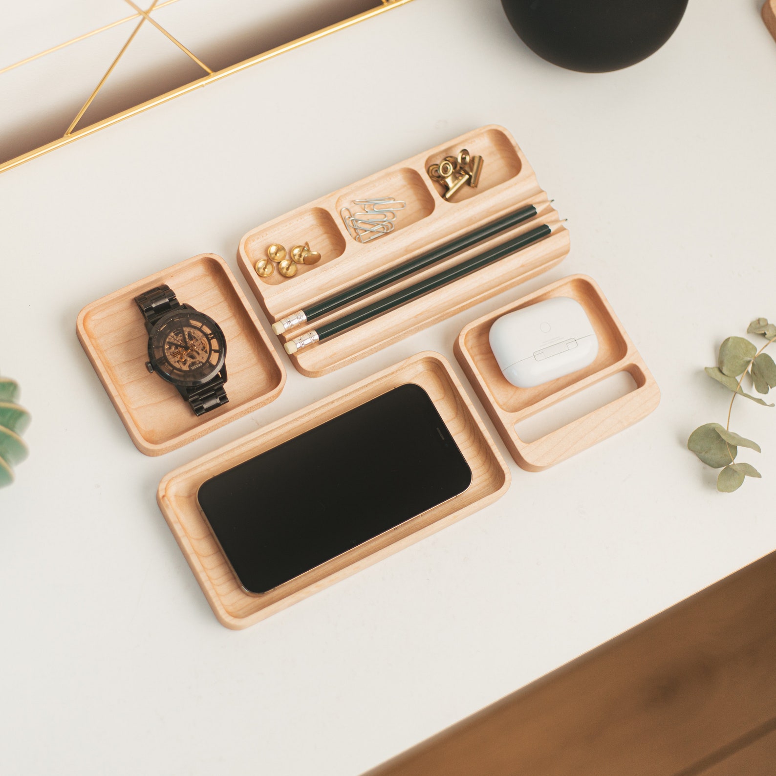 Premium Craftsmanship: Crafted from high-quality wood, this desk organiser is built to last. Its sturdy construction helps it withstand daily use, while its elegant design complements any office decor. The smooth finish and attention to detail make it a sophisticated addition to his desk.