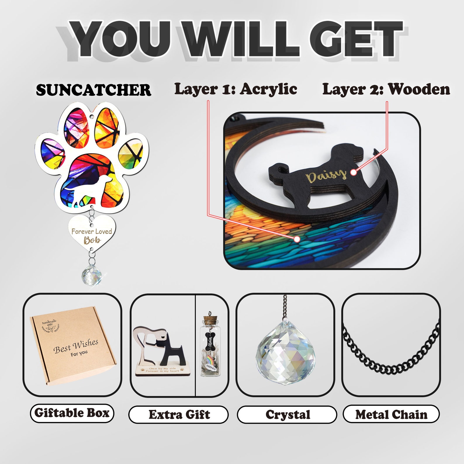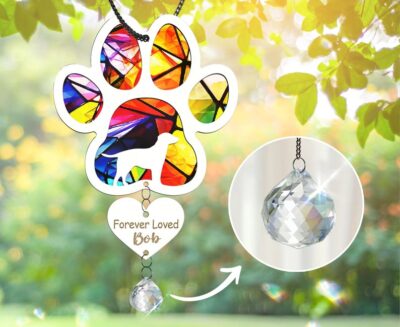- The suncatcher comes with a suction cup for easy hanging, making it a versatile addition to any window or indoor space. A beautiful way to remember your furry friend, this suncatcher casts a rainbow of light, bringing warmth and comfort to your home. A touching memorial to celebrate the life of your dog.