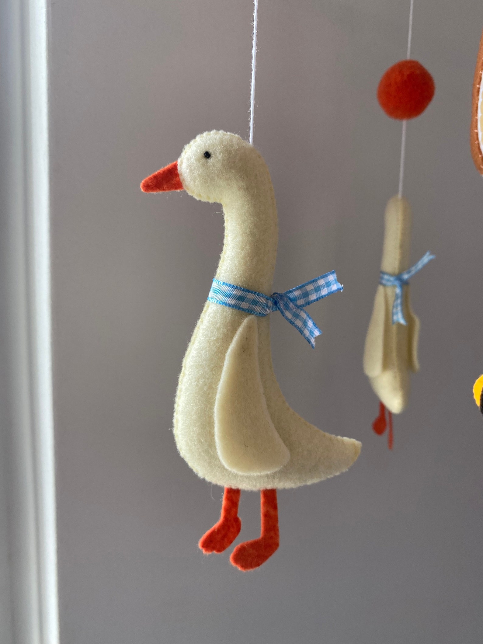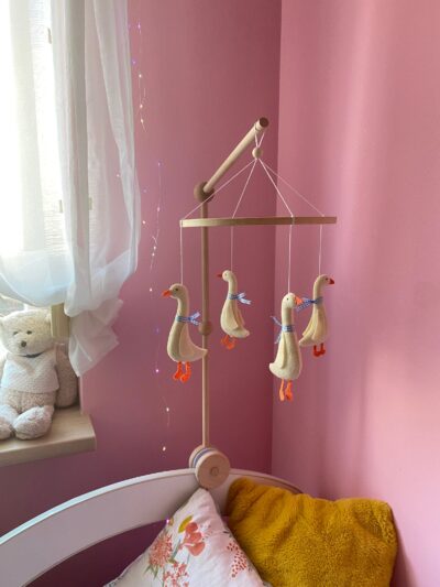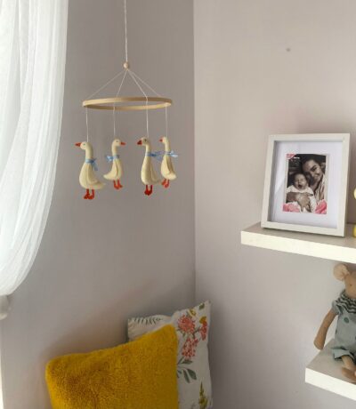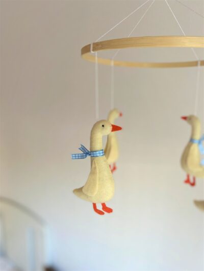 - A delightful baby mobile featuring a charming goose, complete with a lovely blue ribbon.