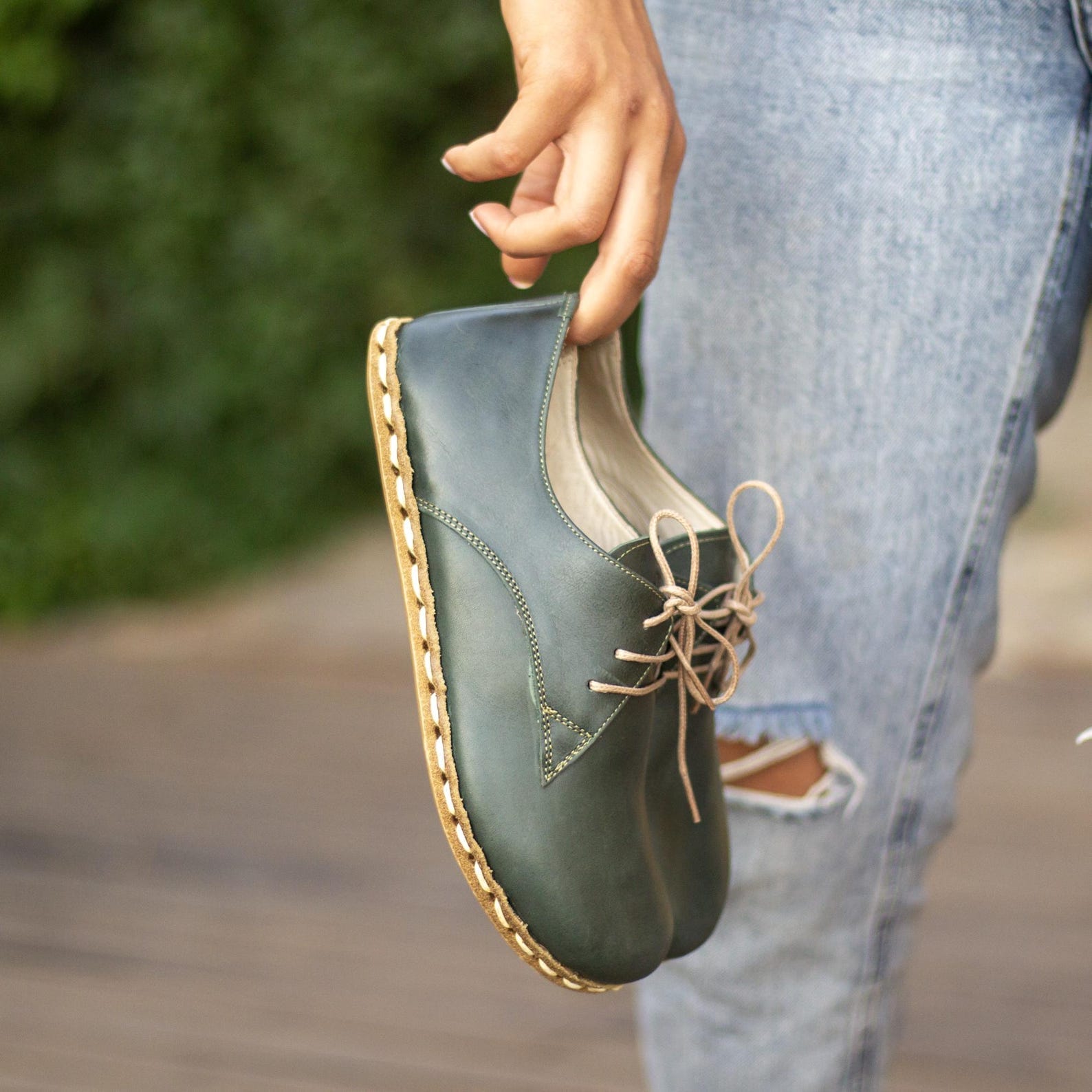 Reconnect with Nature: Experience the grounding benefits of walking barefoot with these stylish Toledo Green Leather Earthing Shoes, designed to help you reconnect with the earth's natural energy.