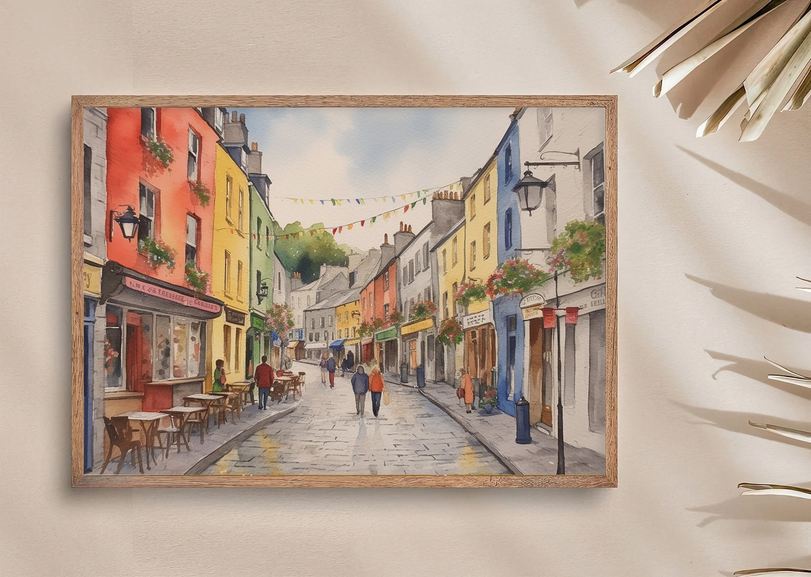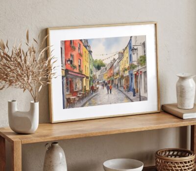 - Bring a piece of the Emerald Isle into your space with this beautiful Galway print. Featuring the iconic Quay Street, this watercolour artwork captures the essence of this vibrant Irish city. The hand-painted details showcase the colourful buildings and lively atmosphere, making it a perfect addition to any room. Printed on premium paper for lasting quality and vibrant colours, this print will transport you to the heart of Galway. A wonderful gift or a treat for yourself, adding a touch of Irish character to your home or workspace.