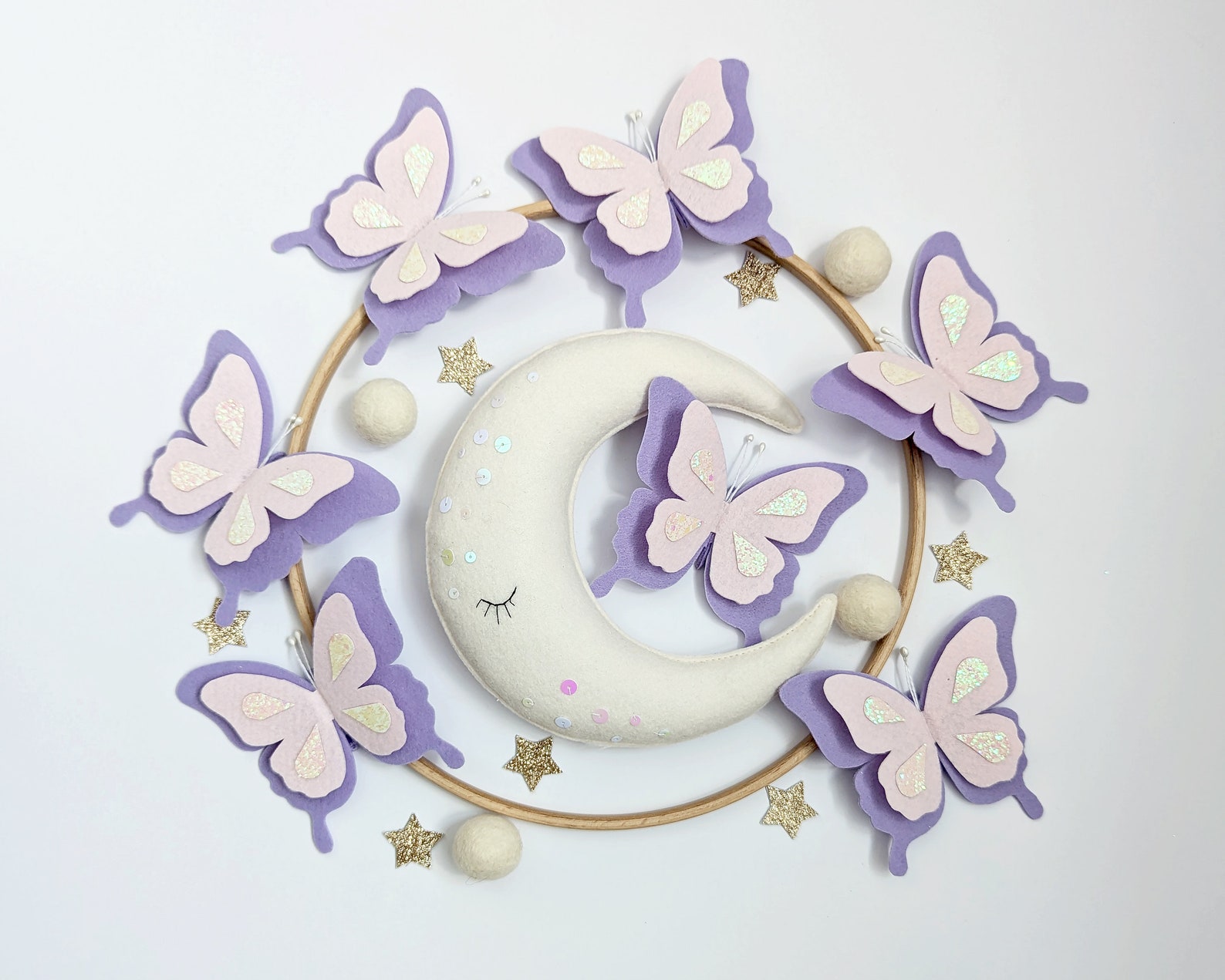 - Handmade felt mobile featuring delicate butterflies in neutral tones.