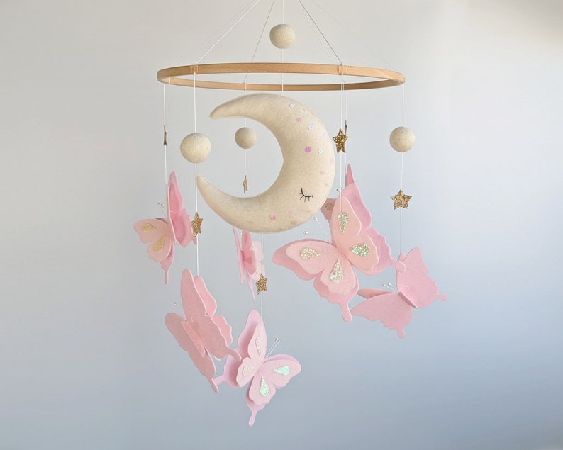 - Simple to assemble and hang, adding a touch of magic to any room. This charming mobile is a delightful addition to your baby's space, creating a calming and enchanting atmosphere. The neutral colours blend seamlessly with any dcor, while the gentle movement of the butterflies captivates and soothes. Made with meticulous attention to detail, this mobile is a beautiful and practical gift for new parents. It's designed to be easily hung above a cot or changing table, providing a focal point for your baby to enjoy. Bring a touch of whimsy and tranquility to your nursery with this exquisite handmade mobile.