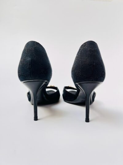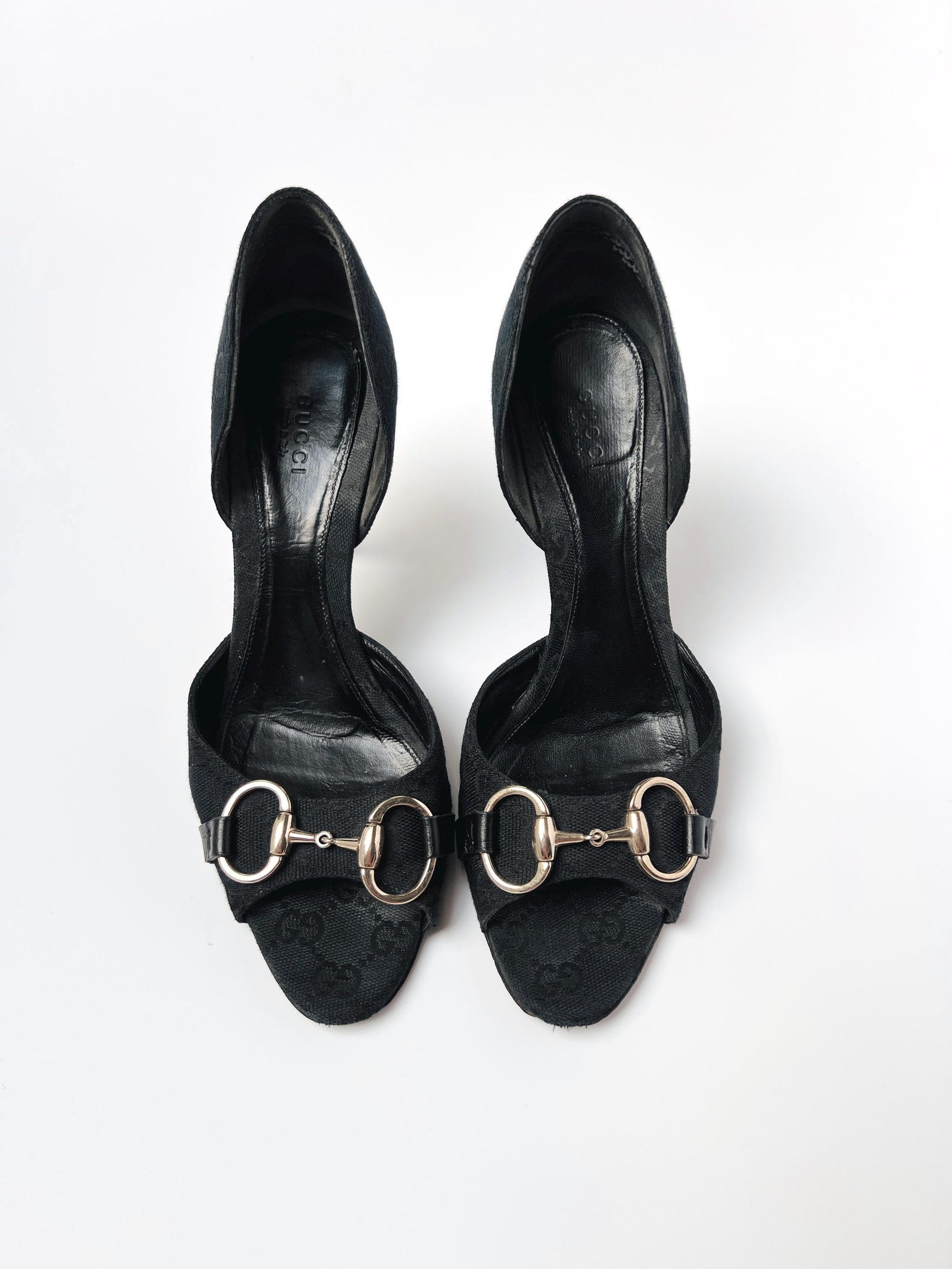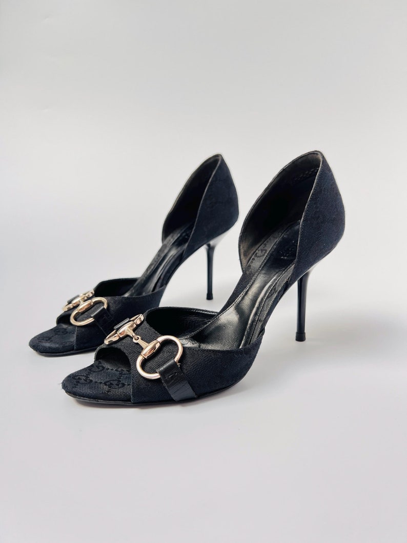 - Authentic Gucci Heels Courts in black monogram canvas with gold-tone hardware. These stylish Gucci court shoes feature the iconic GG logo and a signature horsebit buckle, adding a touch of luxury to any outfit.