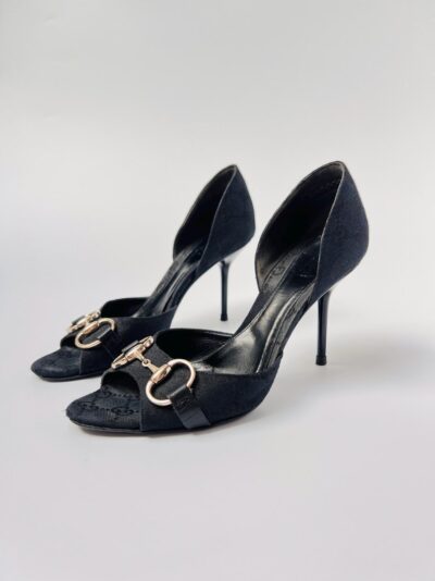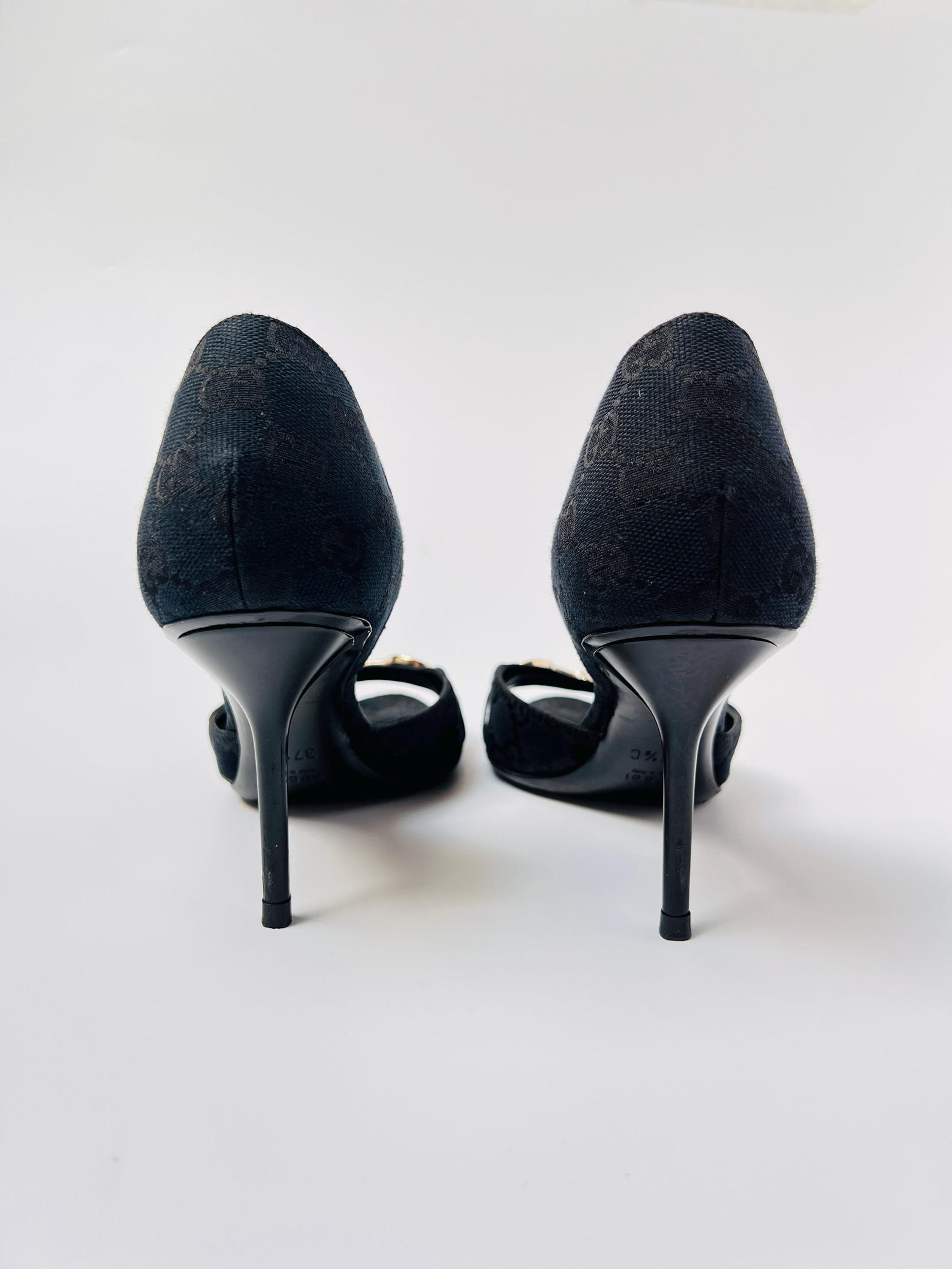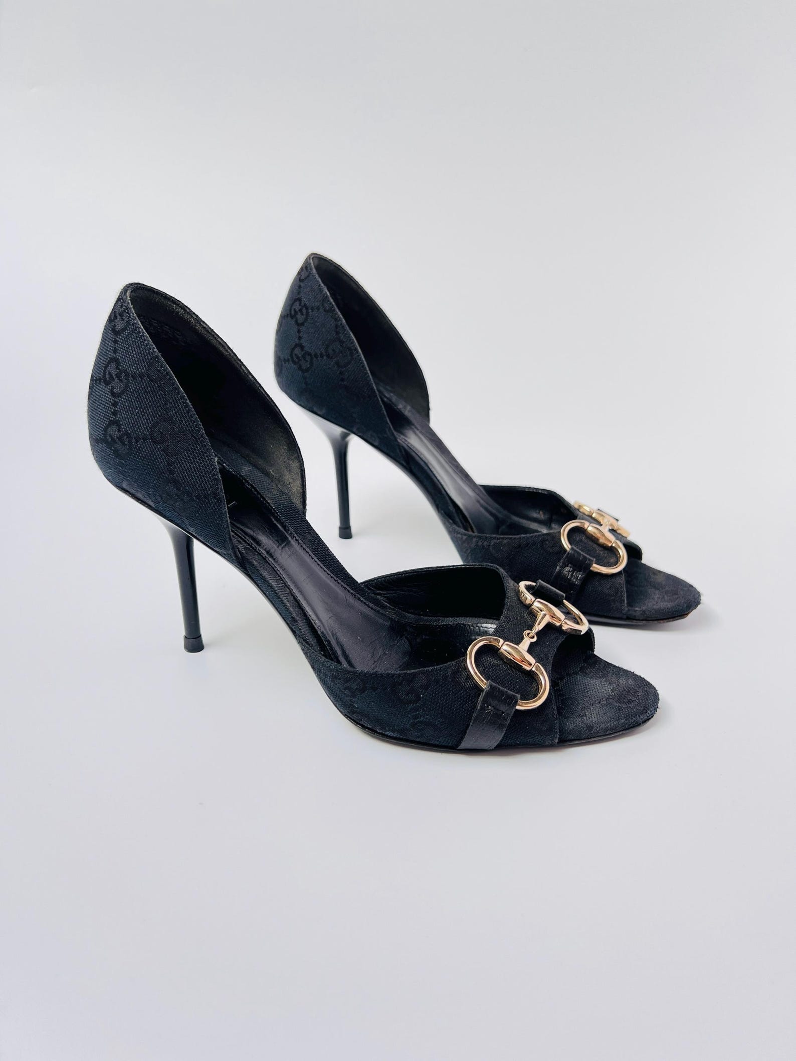 Genuine Gucci Black GG Logo Horsebit Buckle Open Toe Stiletto Heels – Size UK 4.5