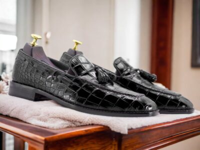 Exotic Alligator Texture: Elevate your style with these handcrafted loafers, showcasing a striking black alligator texture leather for a luxurious and sophisticated look. The unique pattern adds a touch of distinction to any outfit, making a bold statement.