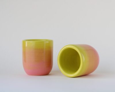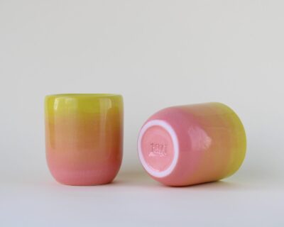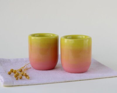 - Handcrafted ceramic espresso cup featuring a captivating pink chartreuse ombre glaze.