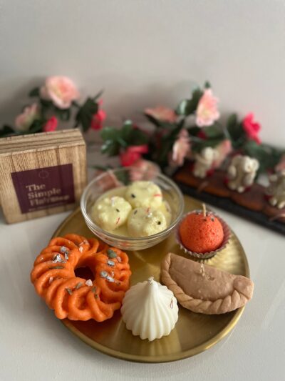 - This set includes four candles, each infused with the distinct fragrance of a beloved mithai: Rasmalai, Gujiya, Imarti, and Modak.