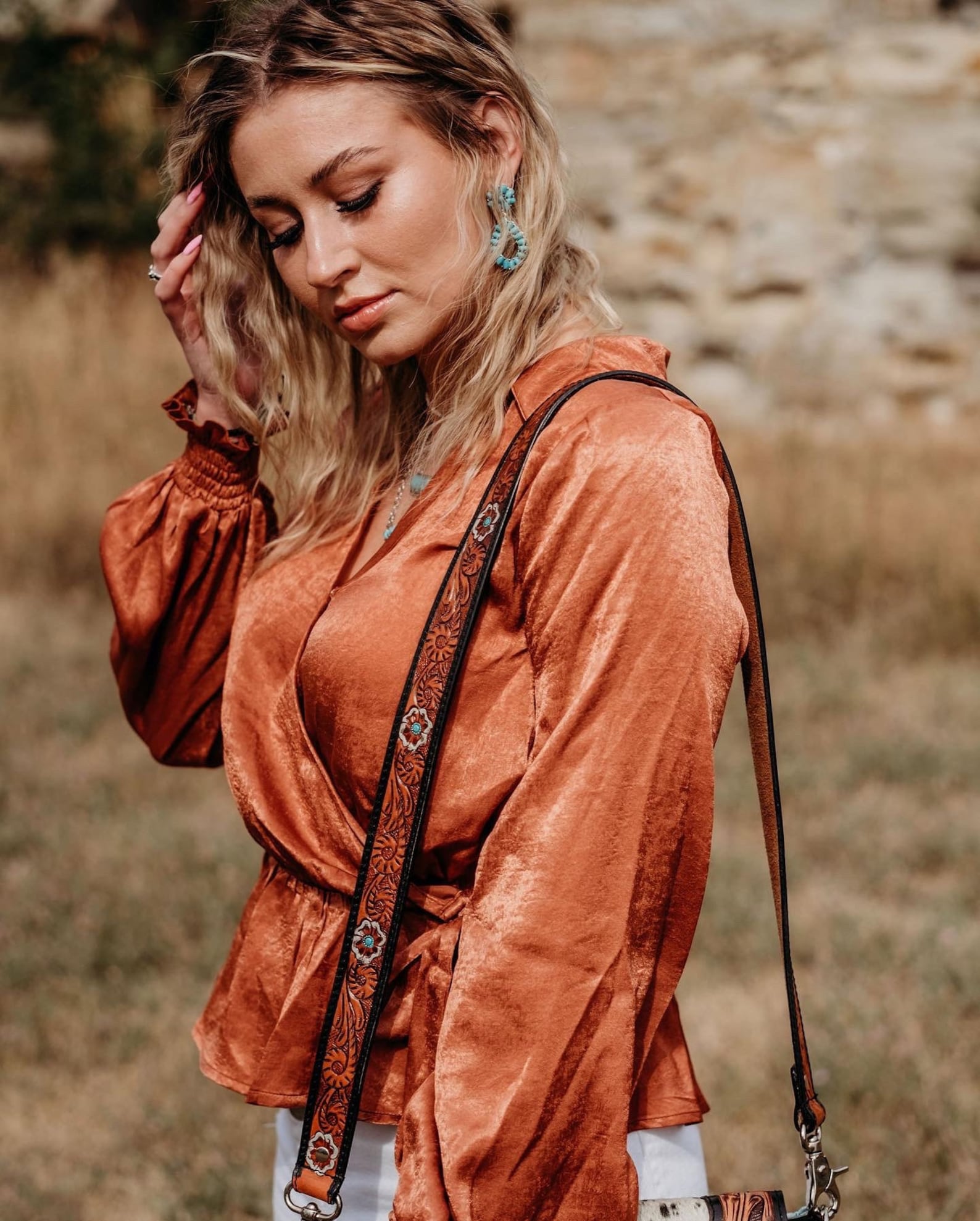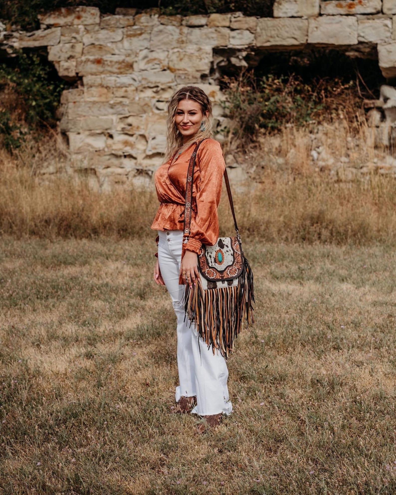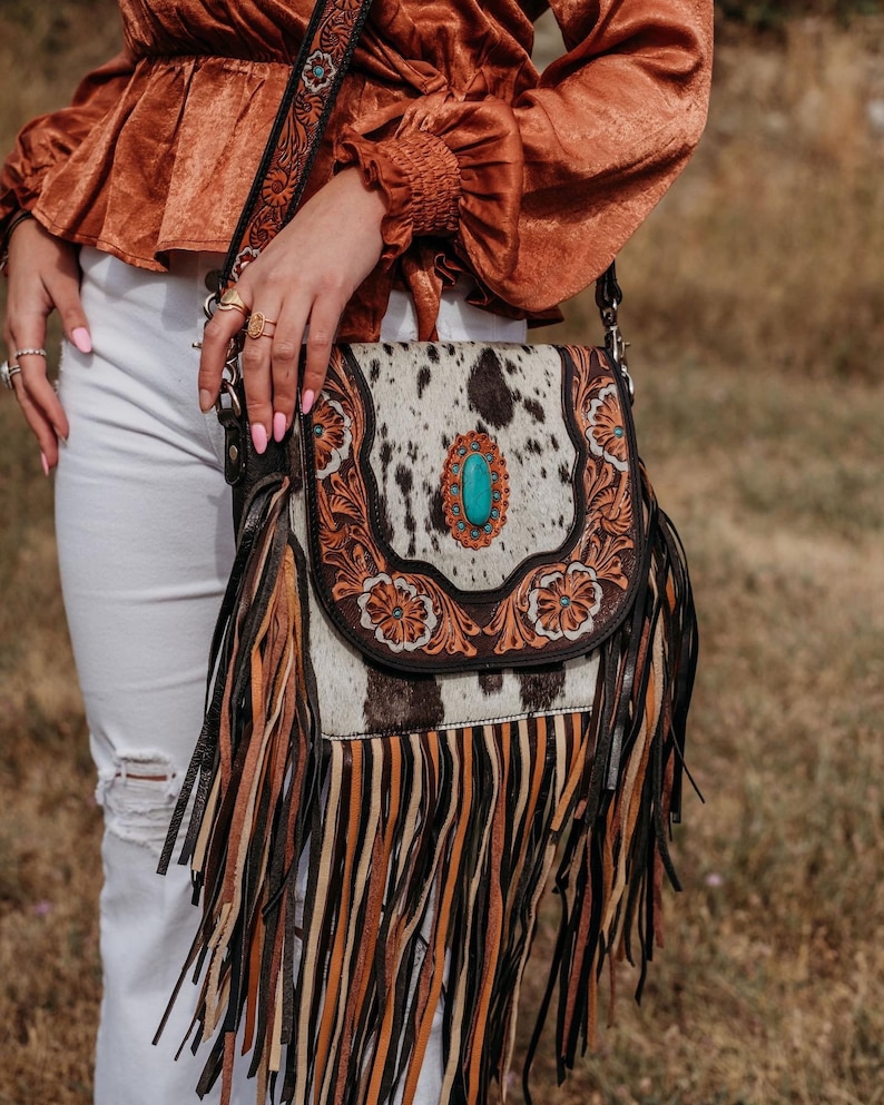 Jessie Jane Fringe Haute Southern Hyde Turquoise Tooled Leather Cowhide Purse – A Statement of Western Chic