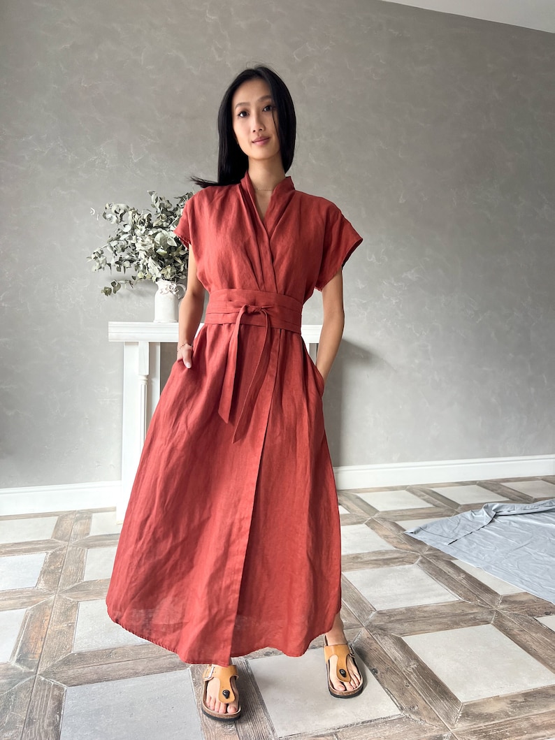 - This stylish linen kimono dress is a wardrobe essential. The flattering wrap design and self-tie belt create a beautiful silhouette, perfect for any figure. Made from breathable, lightweight linen, it's comfortable enough to wear all day long. Dress it up with heels for a night out or keep it casual with sandals for a relaxed daytime look. Ideal for holidays, summer events, or simply adding a touch of effortless style to your everyday wardrobe. A versatile and chic piece that will become your go-to for any occasion.