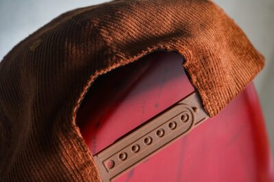- Premium 5-panel corduroy cap in a rich brown shade.