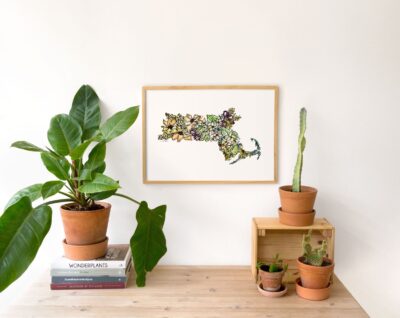 - Celebrate the beauty of Massachusetts with this elegant floral map art print.