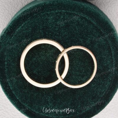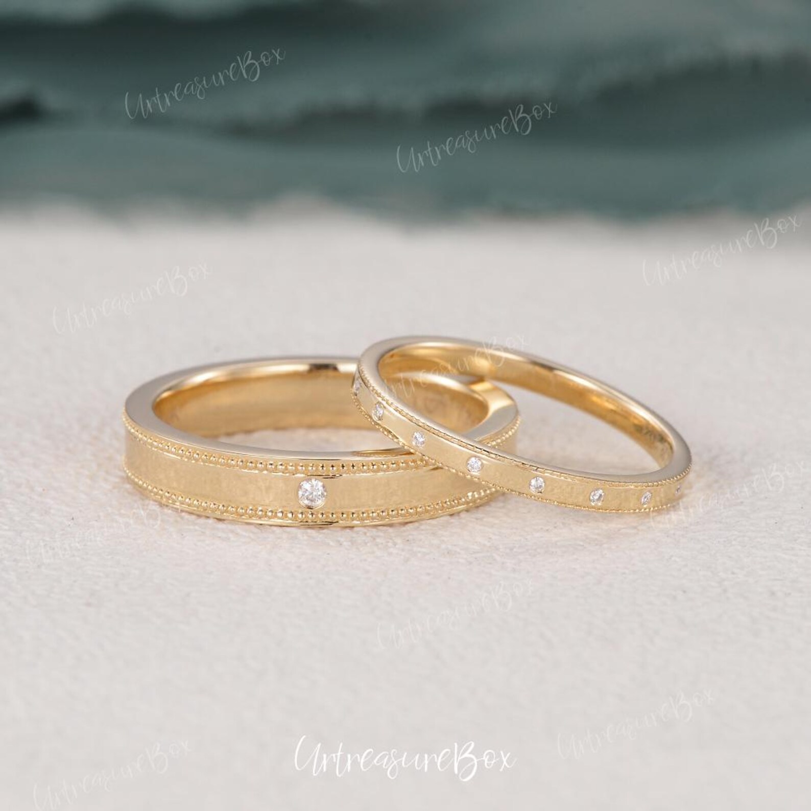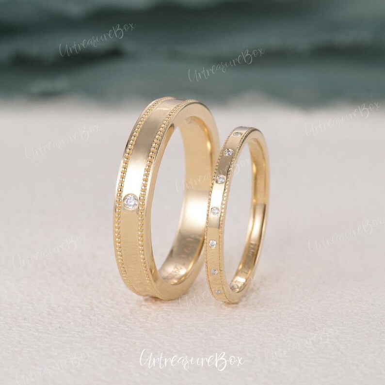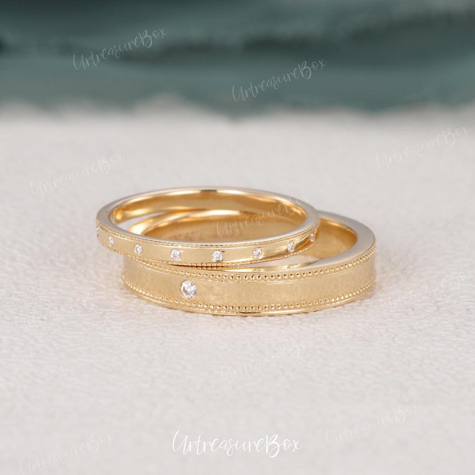 - Exquisite milgrain detailing adds a touch of vintage elegance to these matching wedding bands.