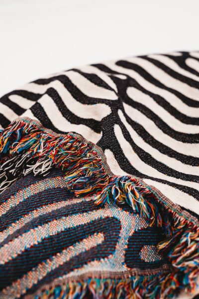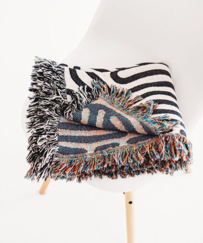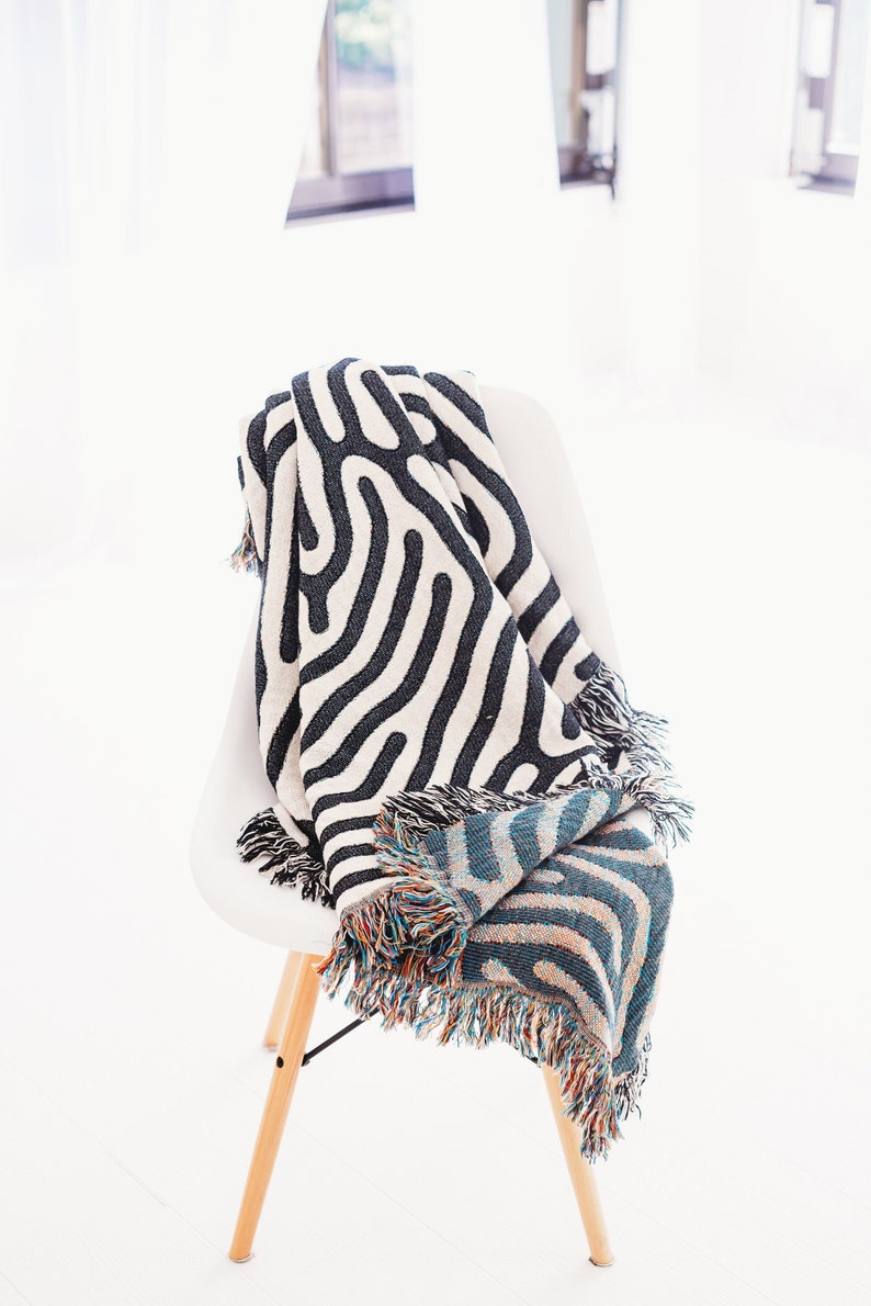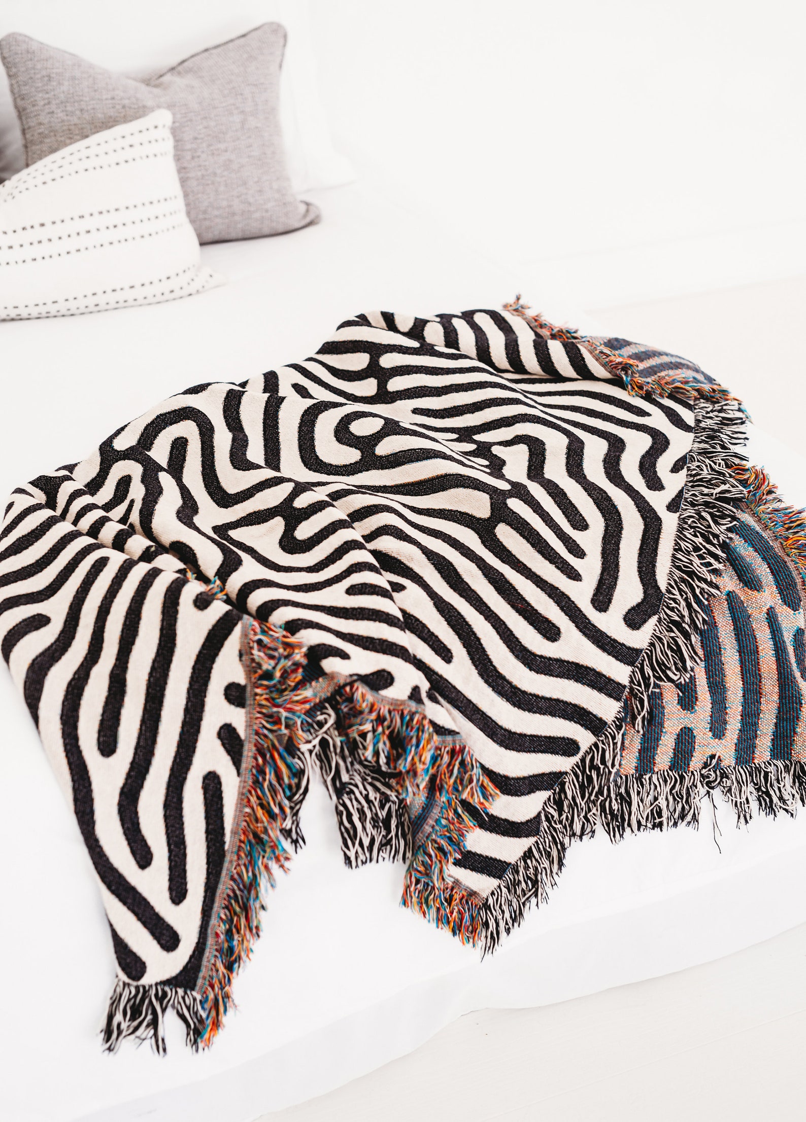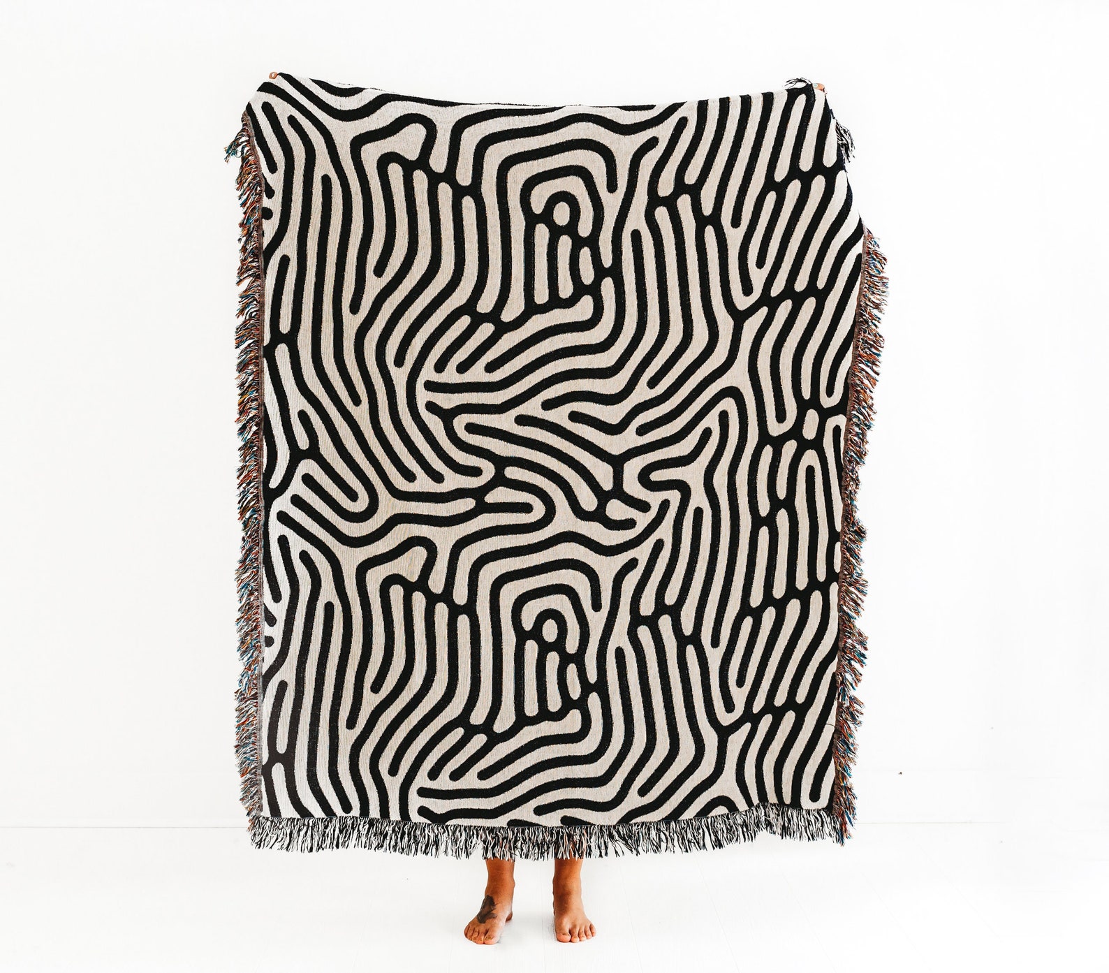 - This modern and minimalist black and white woven throw blanket adds a touch of sophistication to any sofa or bed.