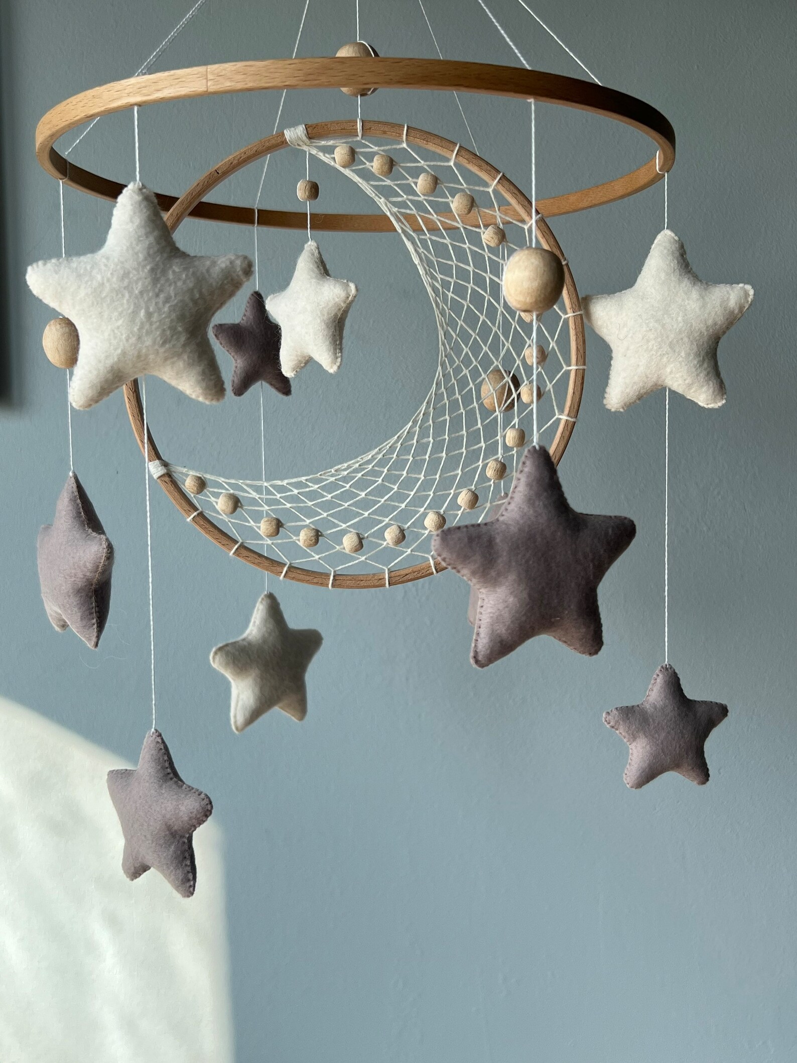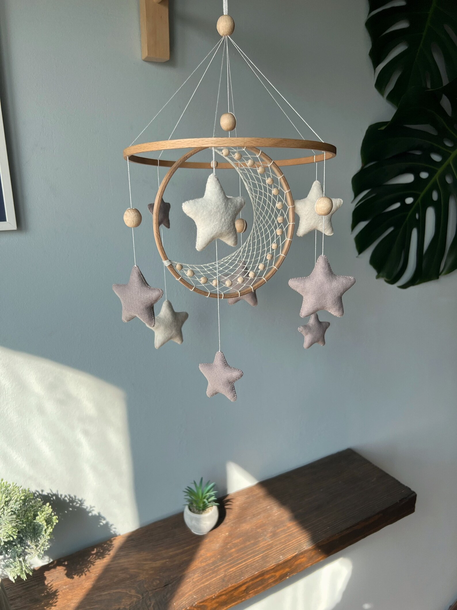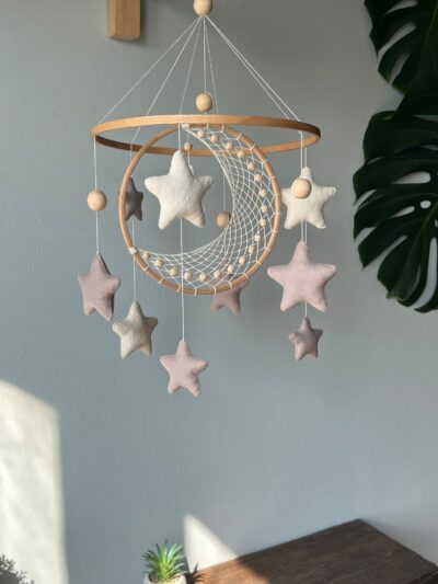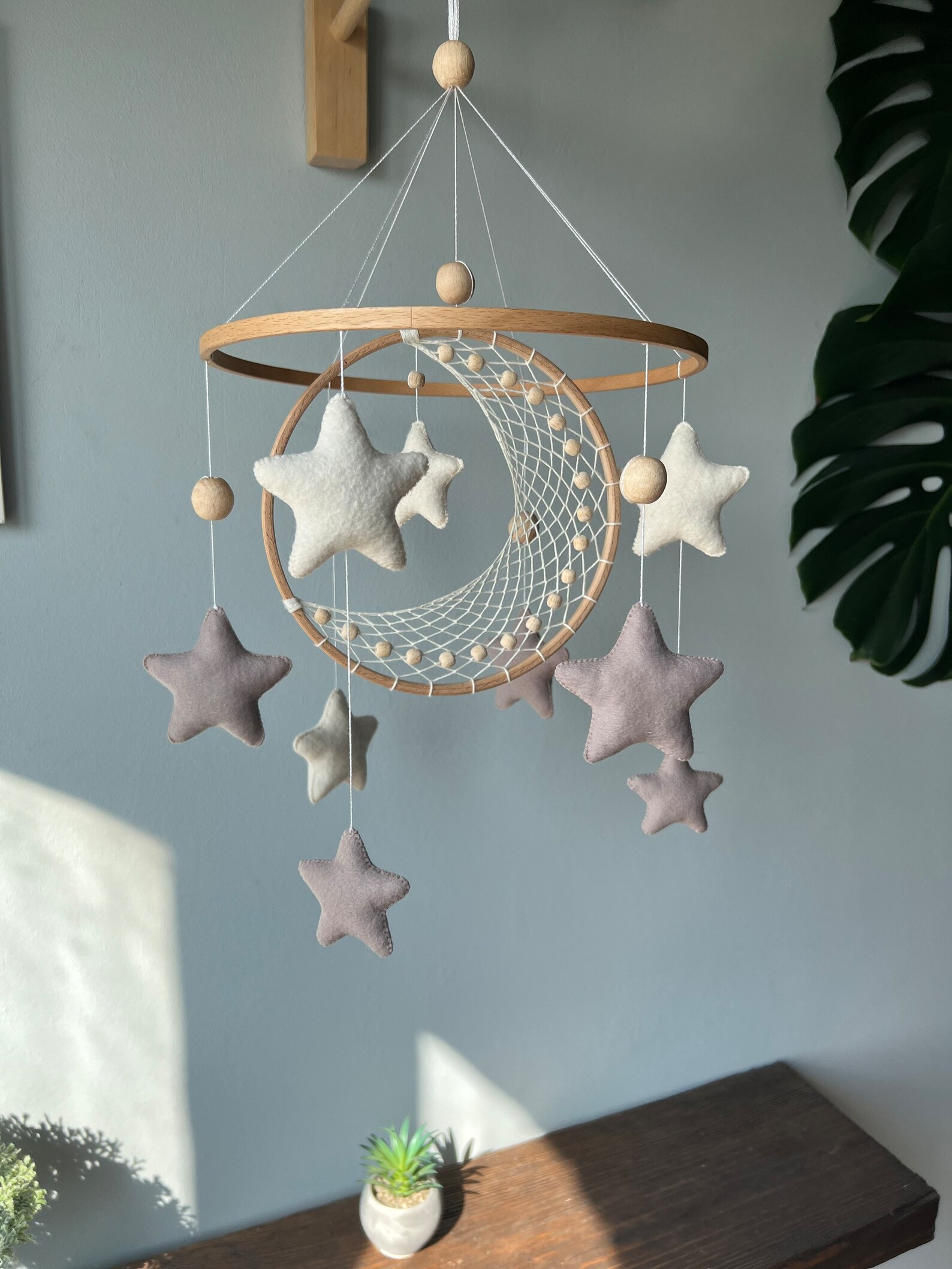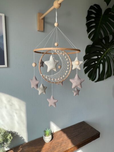 - Encourages visual stimulation and gently soothes babies with its calming movement. This delightful macram mobile adds a touch of celestial charm to your little one's nursery. The handcrafted design, featuring moons and stars in neutral tones, blends seamlessly with any dcor. Made with soft felt and smooth wooden beads, it provides a gentle and comforting sensory experience. Easily hung with a simple loop, this mobile promotes visual development and creates a soothing atmosphere for your baby to drift off to sleep. A beautiful and practical addition to any new baby's room.