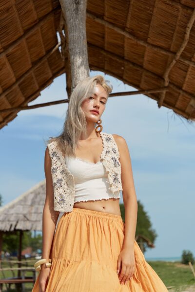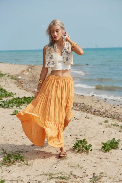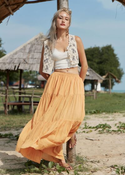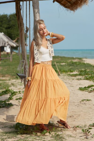 - Perfect for festivals, beach days, or any occasion where you want to embrace your inner free spirit. This gorgeous skirt is crafted from a breathable fabric, help you stay comfortable all day long. The elasticated high waist creates a flattering silhouette, while the tiered design adds a touch of playful movement. The vibrant yellow ochre colour is perfect for adding a pop of sunshine to your wardrobe. Style with sandals and a simple top for a relaxed, bohemian look. A must-have for your summer wardrobe!