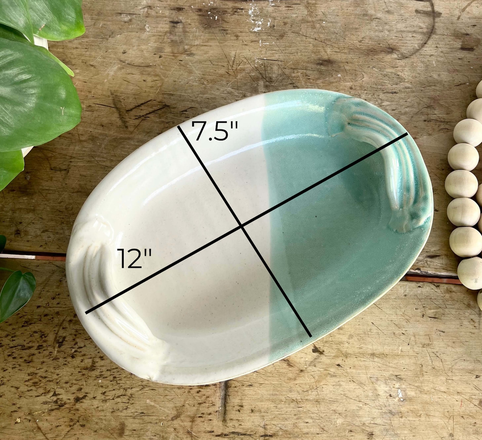 - This stunning, hand-crafted ceramic platter is the perfect addition to any home. Its vibrant green colour will brighten up any table setting, whether you're hosting a dinner party or enjoying a casual meal with family. Use it as a stylish serving bowl for salads, pasta, or snacks, or as a handy catch-all in your hallway for keys and post. It's also ideal for serving up nibbles during games night. Made from durable ceramic, this platter is built to last and is easy to clean. It's the perfect hostess gift for any occasion, adding a touch of elegance and practicality to any home. A truly versatile and beautiful piece!