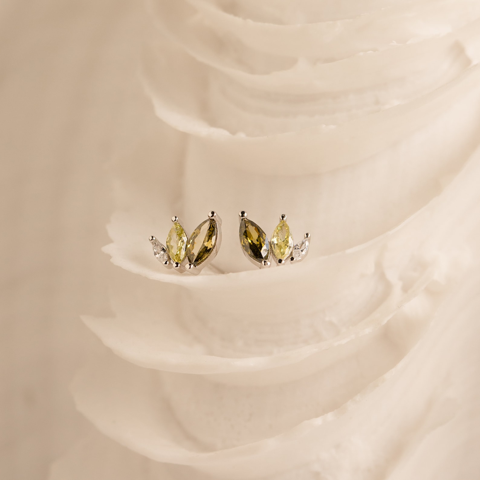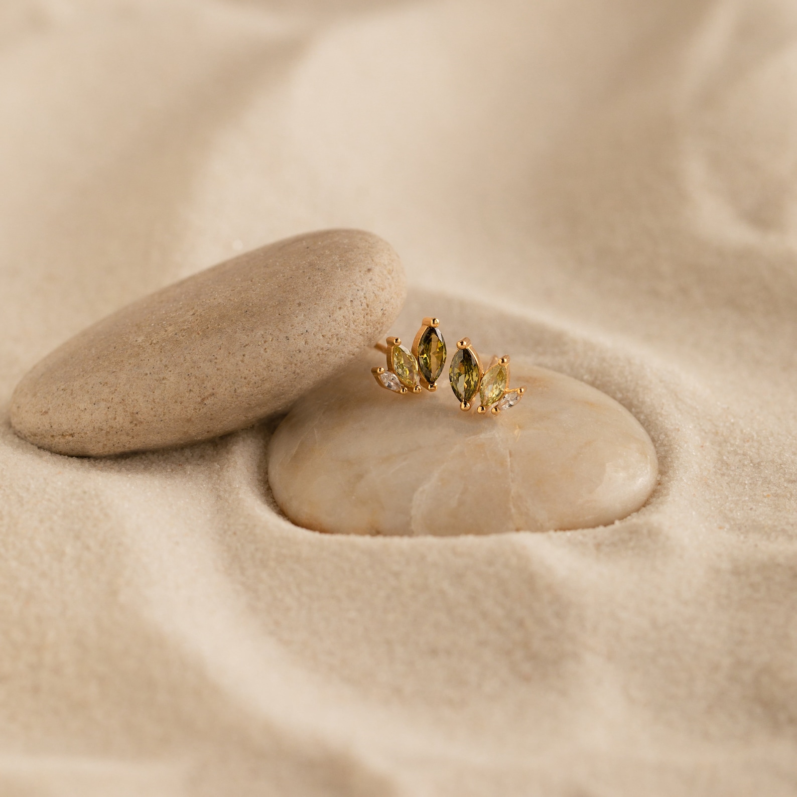 - Glistening peridot marquise gemstones nestled in a dainty leaf design.
