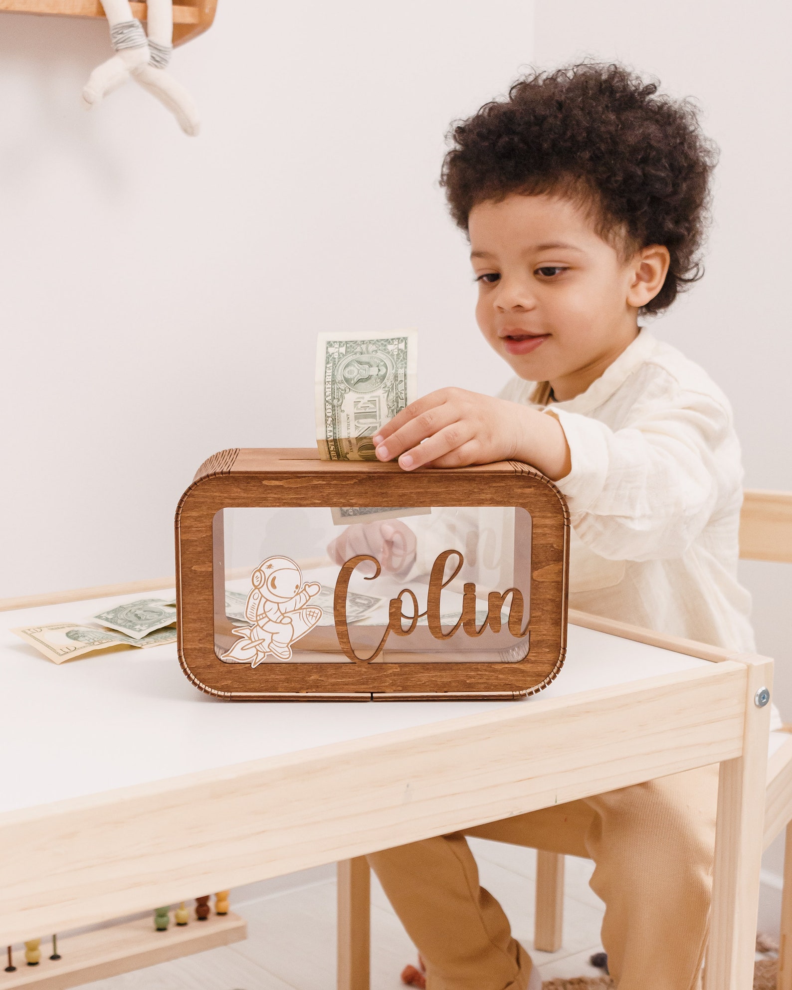 - Personalised Money Box: Create a unique keepsake with your child's name engraved on this wooden money box. A charming way to encourage saving!