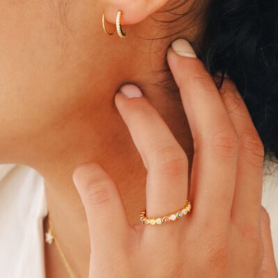 - Rainbow enamel evil eye ring adorned with dainty diamonds.