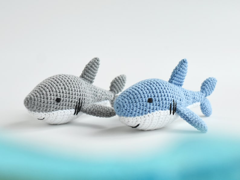 - Hand-crocheted shark amigurumi soft toy.