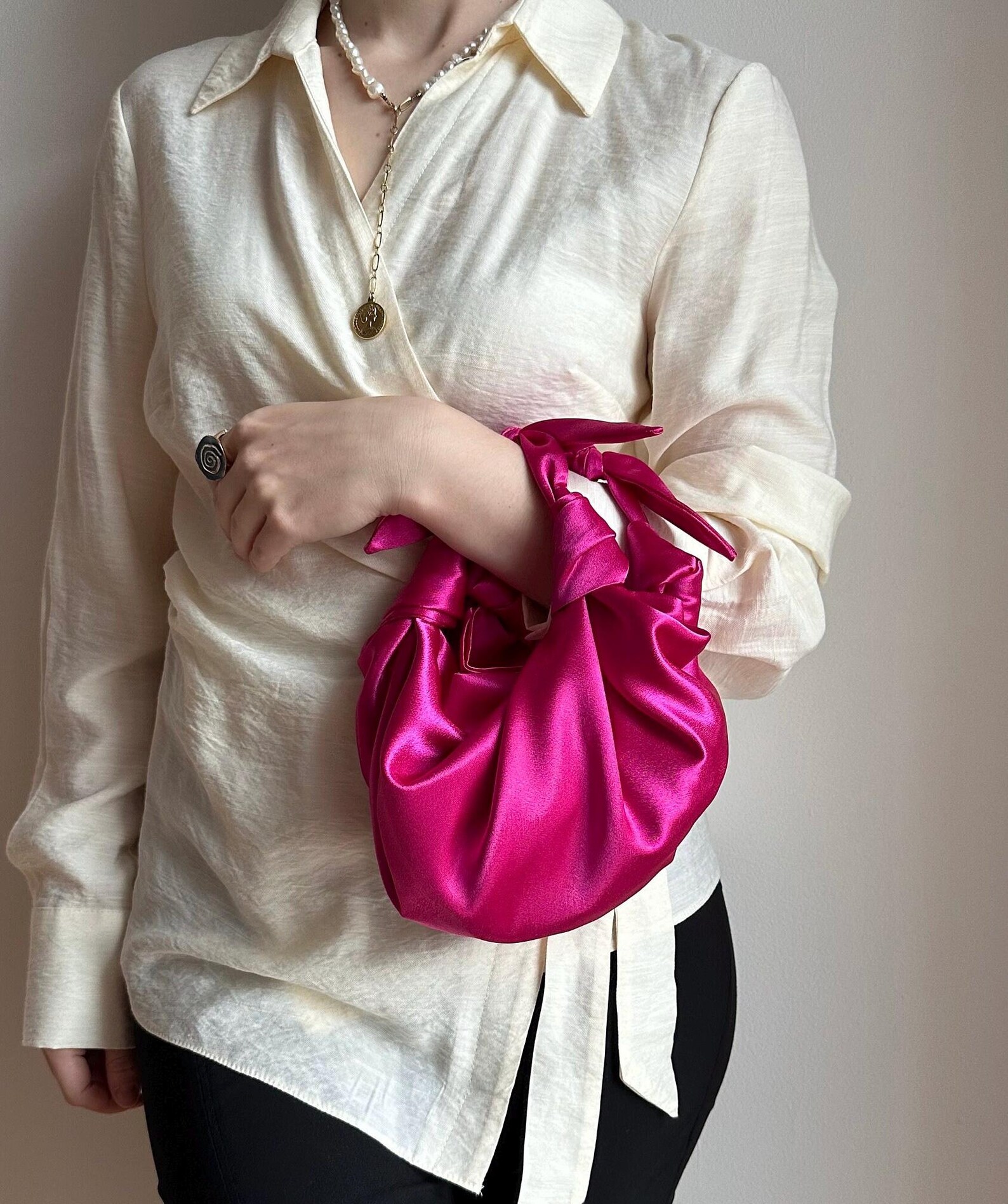 - Stunning satin clutch bag in a delightful pink shade, featuring intricate knot detailing for added elegance.