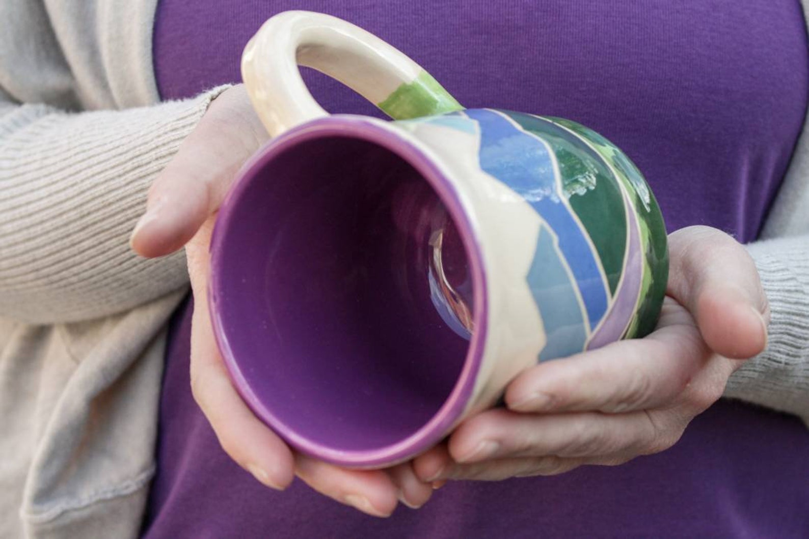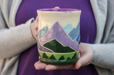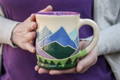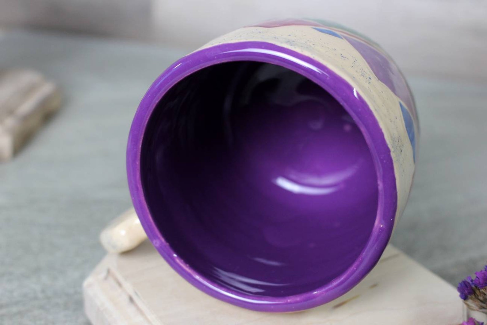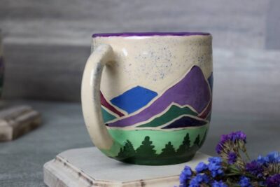 Handmade Spring Ceramic Mug, 400ml Teacup with Mountain & Forest Design, Eco-Friendly Lilac Pottery
