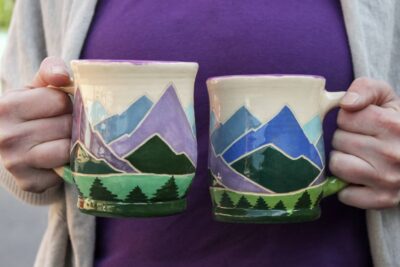 - Handcrafted 14oz ceramic mug featuring a unique mountains and forest illustration.