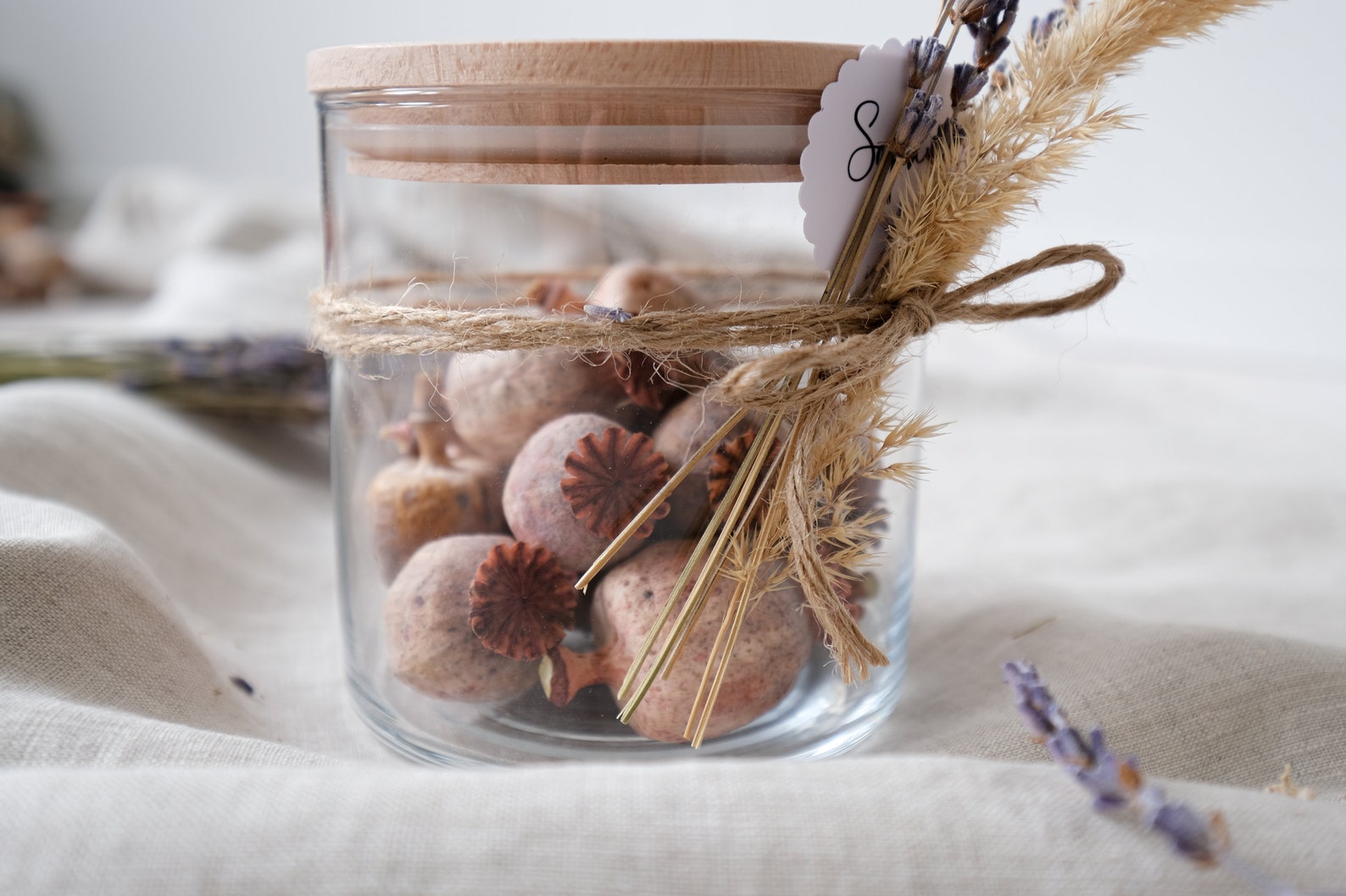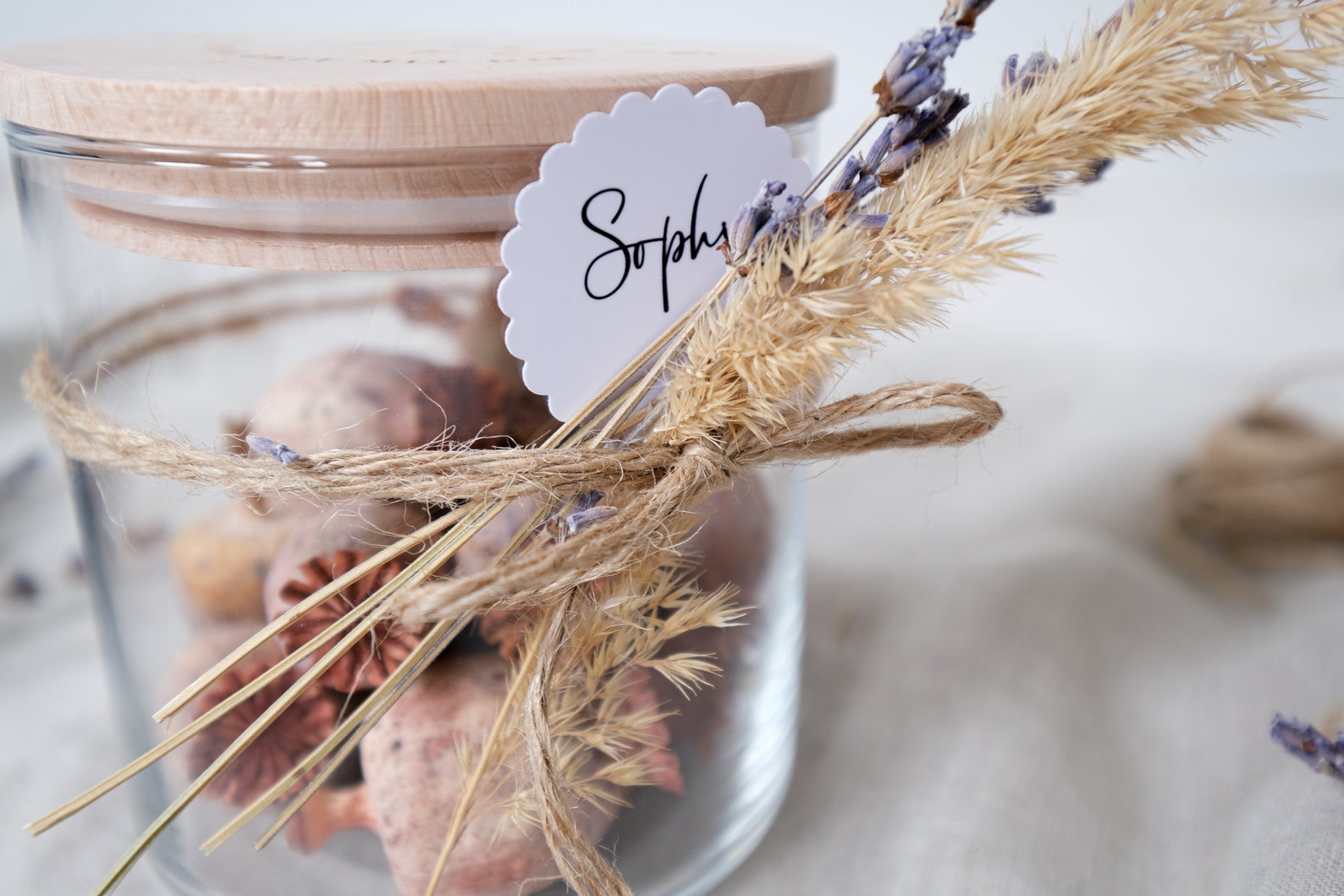 - Engraved glass storage jar with a wooden lid, perfect for storing bits and bobs or treasured keepsakes.