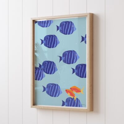 - A vibrant, striped blue fish art print by Jorey Hurley, perfect for adding a touch of seaside charm to any room in your home.