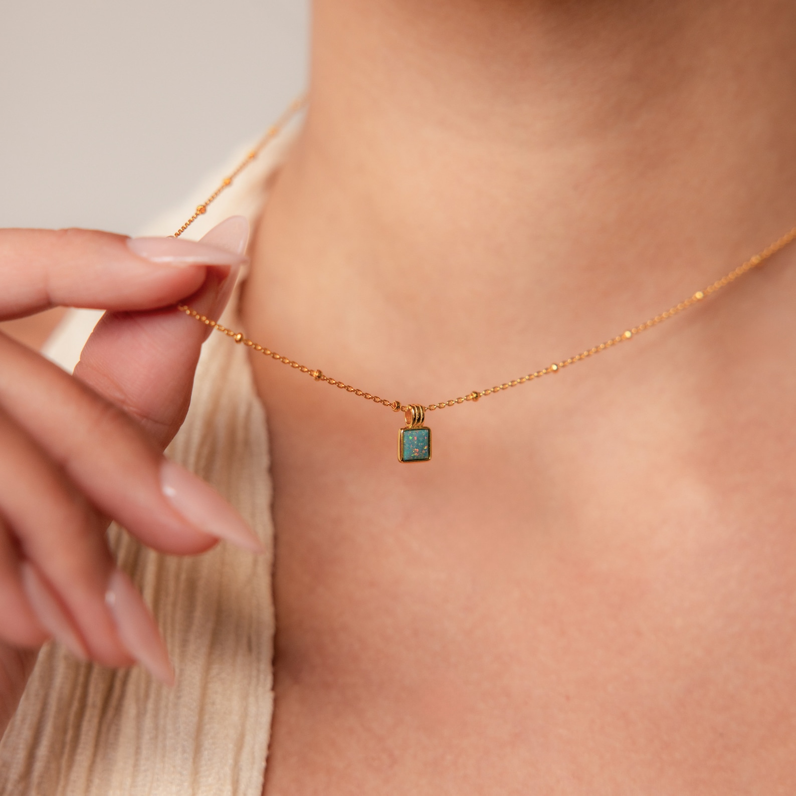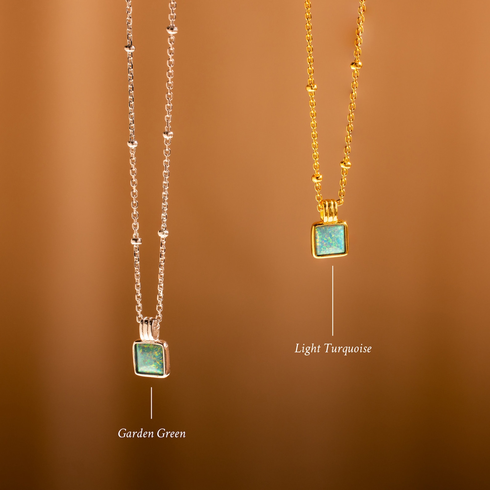 Turquoise Opal Pendant Necklace – Minimalist Square Charm Satellite Chain (UK)
