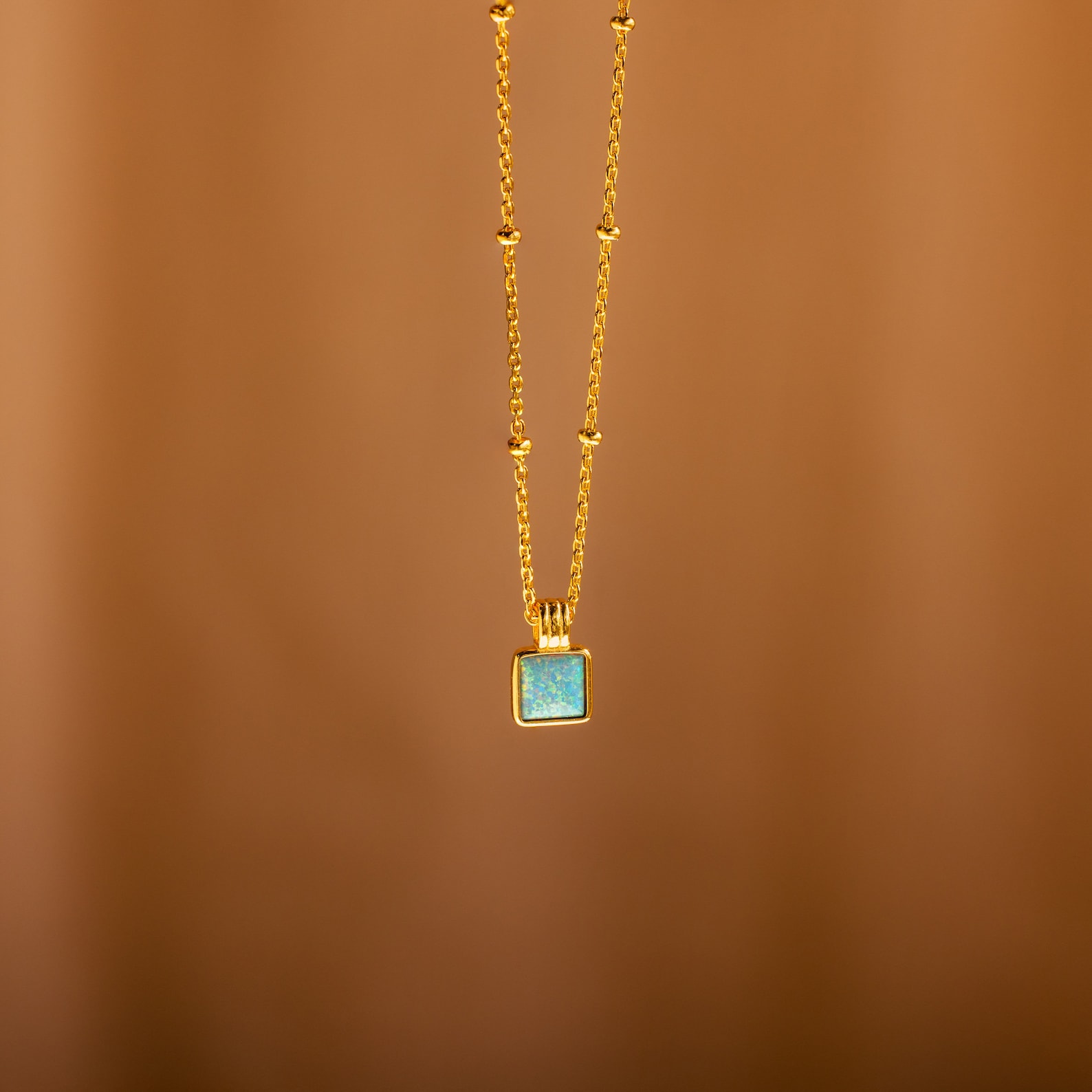 This gorgeous turquoise opal pendant necklace is the perfect addition to any jewellery collection. The shimmering opal catches the light beautifully, adding a touch of elegance to any outfit. The dainty square charm and delicate satellite chain create a subtle and sophisticated look, ideal for both everyday wear and special occasions. Crafted with durability in mind, this necklace is designed for lasting enjoyment. Whether you're treating yourself or searching for a thoughtful gift for a sister, friend, or loved one, this necklace is sure to be cherished. Its minimalist design fors it will complement any style, making it a versatile and timeless piece.