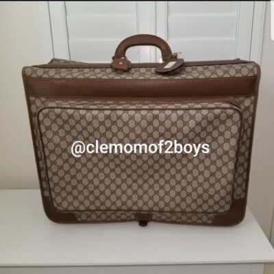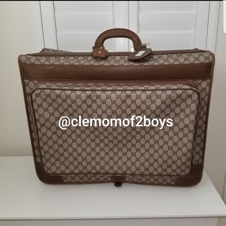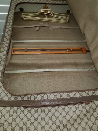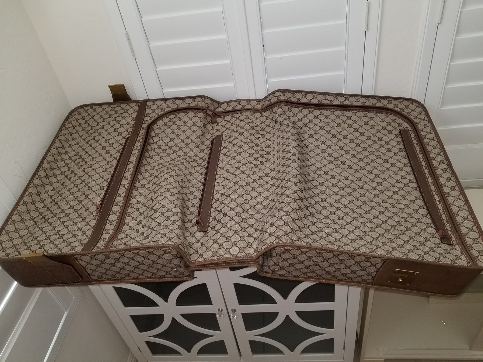 - This Gucci garment bag is in superb, near-mint condition, showcasing the iconic GG monogram canvas. A true vintage find, it offers a stylish and practical solution for transporting your clothes. The folding design fors it can be stored away easily when not in use, saving valuable space. Inside, you'll find a range of pouches and hangers, perfect for keeping your garments organised and crease-free. For added peace of mind, the bag comes with its original lock and keys, help your belongings are safe and secure during transit. A luxurious and timeless travel accessory.