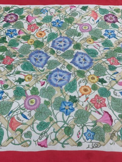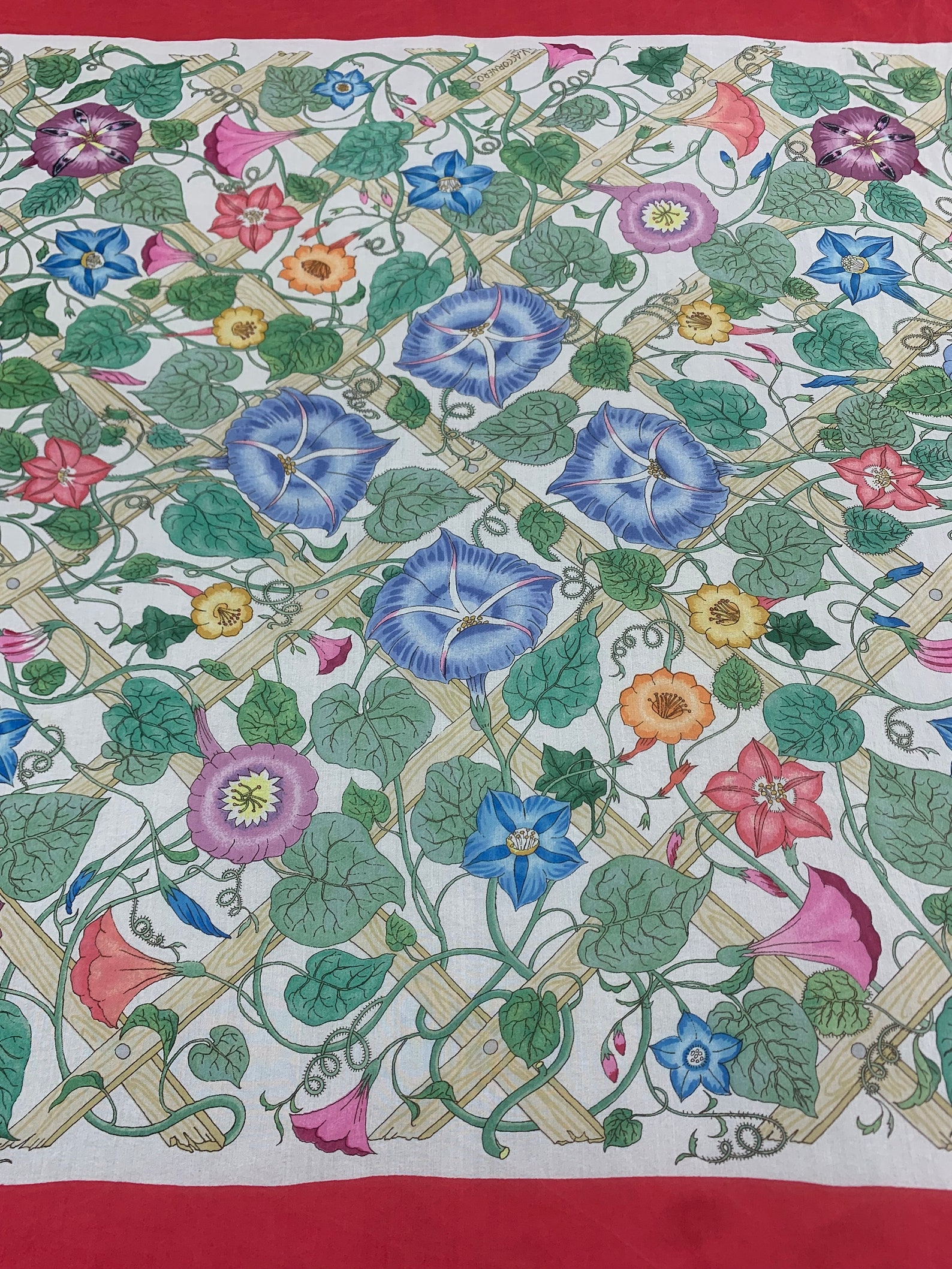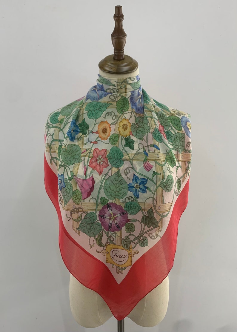 - This genuine vintage Gucci silk scarf boasts a vibrant floral design, a true statement piece from the nineties. Made in Italy from the finest silk, it offers a luxurious feel and drapes beautifully. A timeless accessory, ideal for adding a sophisticated flourish to your wardrobe. Elevate your look with this iconic piece of fashion history. A must-have for any collector of vintage designer accessories.