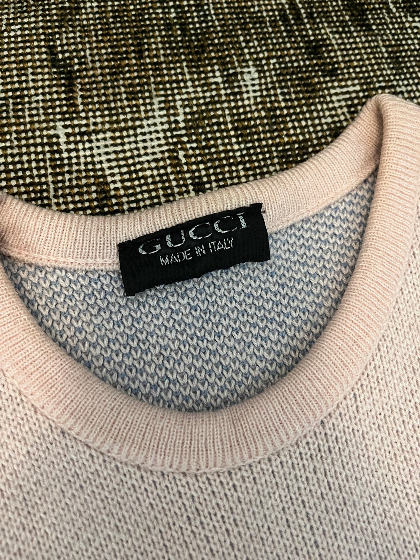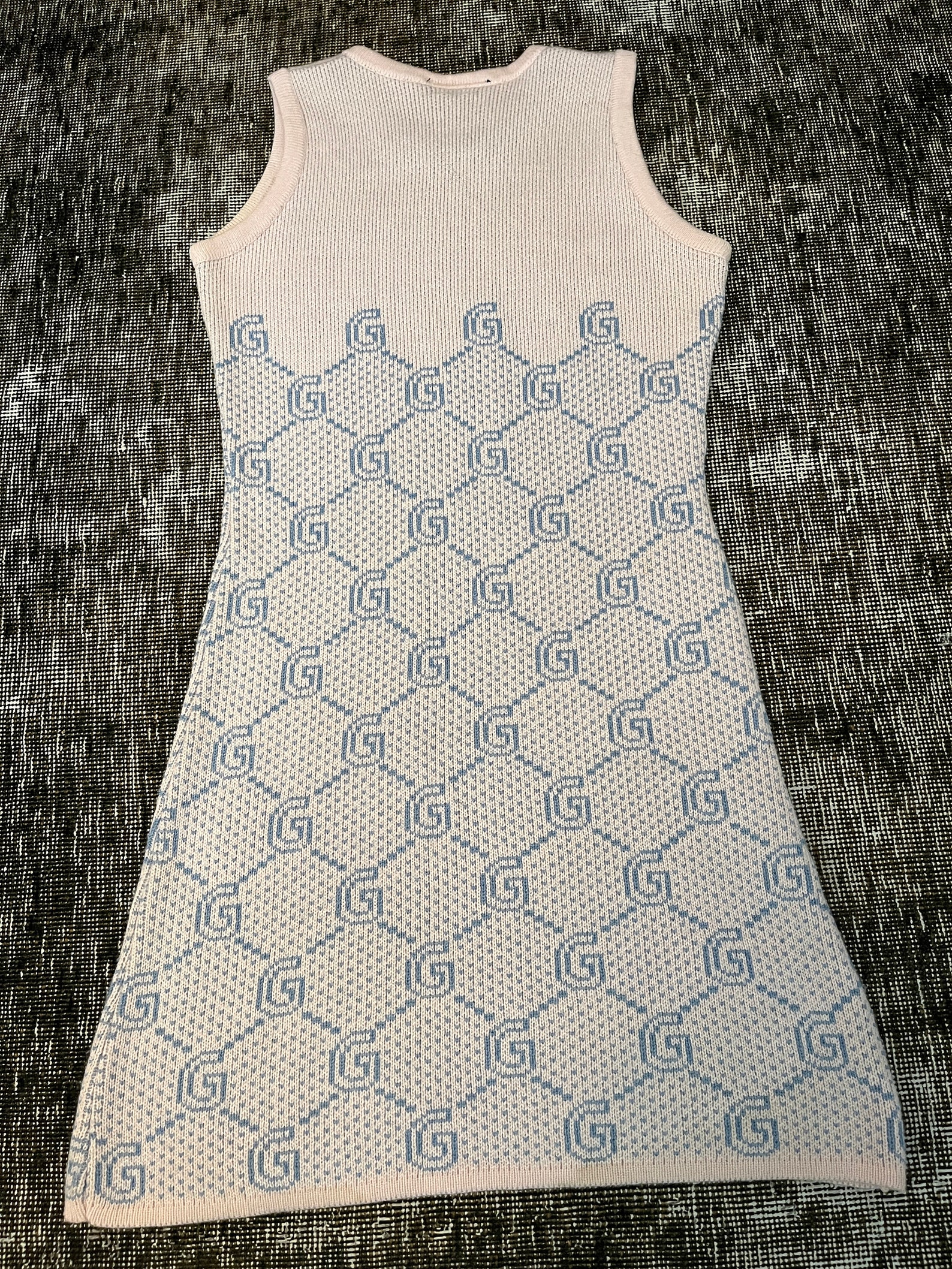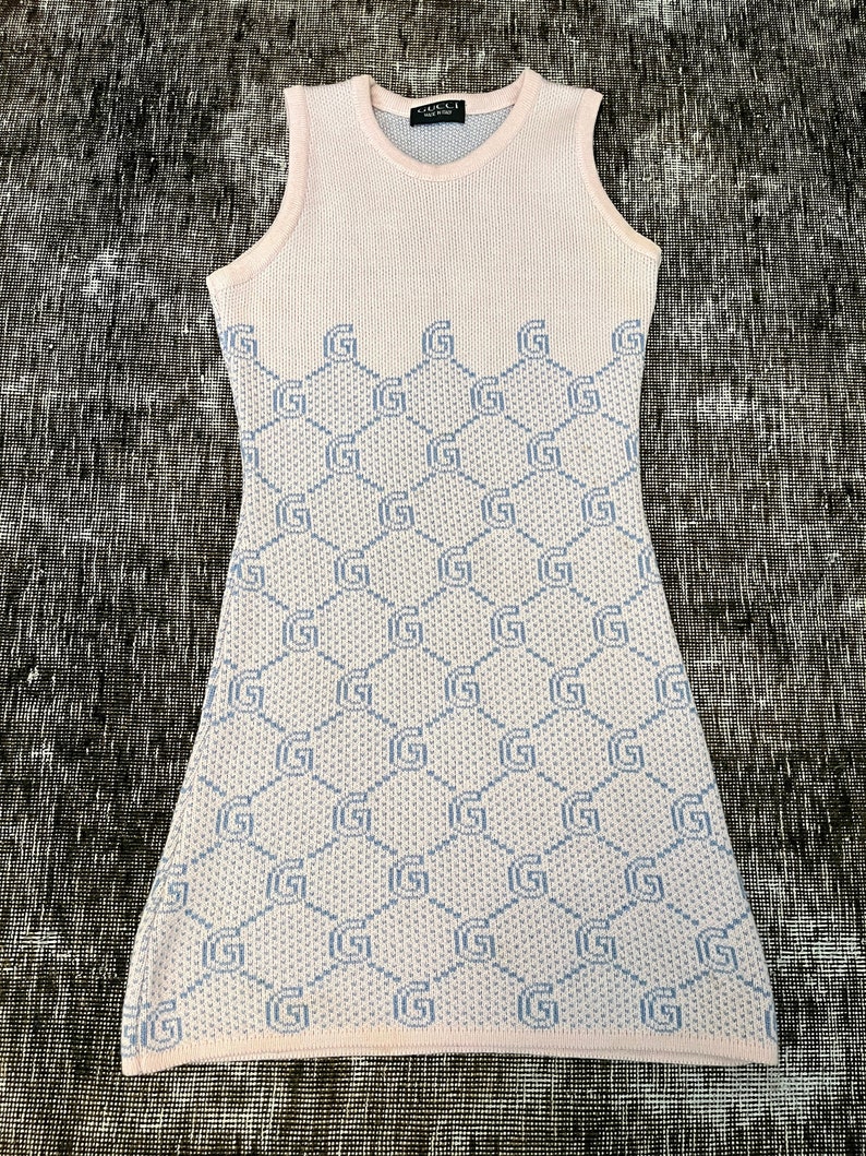 - This genuine vintage Gucci mini dress is a proper statement piece! Crafted in Italy, this eye-catching number features a delightful pink and baby blue knitted design. The iconic Gucci logo is embroidered on the front, adding a touch of luxury. Ribbed detailing at the neckline, cuffs, and hem provides a snug and stylish fit. A rare find for any fashion enthusiast, this authentic Gucci dress is perfect for adding a touch of vintage glamour to your wardrobe. Get your hands on this pre-loved gem and own a piece of fashion history. A true investment piece that will turn heads!