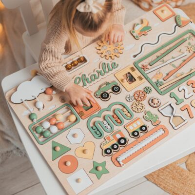 Personalised Woodland Activity Board: Montessori Sensory Toy for Baby Boys